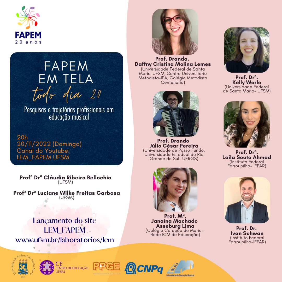Vinculado ao Centro de Educação e ao Programa de Pós-Graduação em Educação da UFSM, o grupo de pesquisa Formação, Ação e Pesquisa em Educação (Fapem) completa 20 anos de existência em 2022. O grupo agrega-se também ao Laboratório de Educação Musical (LEM), sob a coordenação das professoras Cláudia Ribeiro Bellochio e Luciane Wilke Freitas Garbosa. Neste domingo (20), o grupo realiza um evento on-line em comemoração ao seu aniversário: Fapem em Tela Todo Dia 20 – Pesquisas e Trajetórias Profissionais em Educação Musical. Como convidados, estarão presentes seis professores, de diferentes instituições de ensino, os quais vão contar ao público as suas experiências em educação musical, em um bate-papo que terá a mediação das coordenadoras do LEM. A atividade começa às 20h no canal do LEM e Fapem no Youtube. A relação dos professores convidados, os quais são membros ativos do laboratório, está disponível na imagem ao lado.
