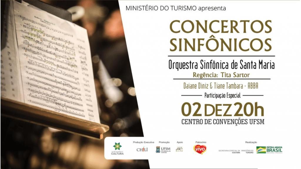 No dia 2 de dezembro, às 20h, acontece a primeira edição dos Concertos Sinfônicos, no Centro de Convenções da UFSM, com entrada franca. O evento é protagonizado pela Orquestra Sinfônica de Santa Maria, que desenvolverá um especial de Natal com trechos do Musical ABBA. O Concertos Sinfônicos tem o patrocínio da Rede Vivo Supermercados, apoio da Boske Paisagismo, produção executiva da Chili, com realização da Secretaria Especial da Cultura/Ministério do Turismo.