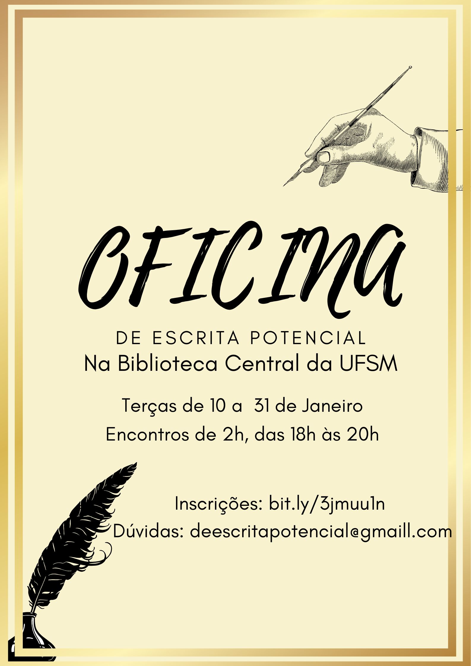 Nas terças-feiras de janeiro, a partir do dia 10, será oferecida oficina de escrita potencial na Biblioteca Central da UFSM, das 18h às 20h. A atividade é gratuita e aberta também à comunidade externa.