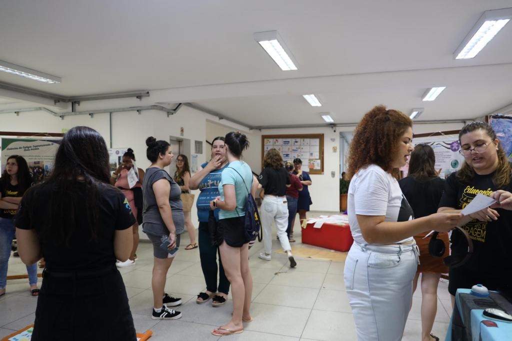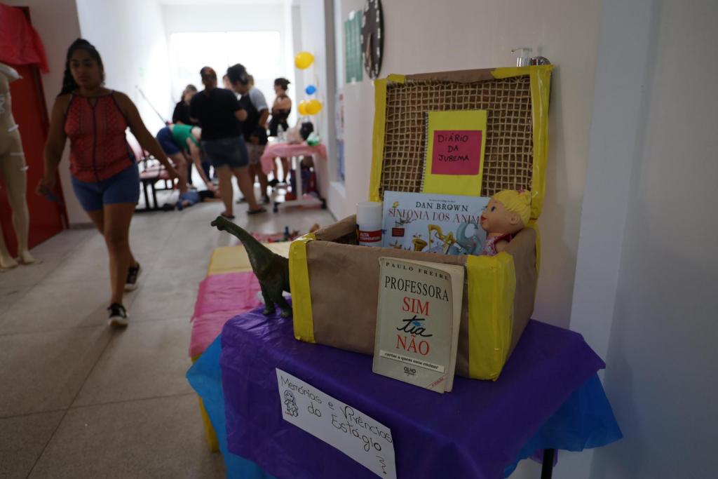 Nesse espaço, as discussões a respeito das temáticas encontradas ao longo dos estágios estavam presentes, conforme a professora Kelly Werly. “A ideia é fazer dessa experiência um balanço de como cada aluna se situou em cada turma e, assim, dar um retorno à comunidade e aos professores”, conta. Kelly explica que no ambiente do seminário, realizado no hall do prédio 16B, buscou-se levar ao público a experiência com alguns elementos que fizeram parte do estágio. Como na entrada do prédio, onde as estagiárias expuseram banners descritivos de como foi o trabalho em sua escola. A seguir, o visitante encontrava uma sala lúdica, com luzes, bonecos, desenhos, livros, brinquedos e demais figuras de imersão criativa. No final do corredor, havia espaço de interação com o ambiente, com base em conceitos pedagógicos.