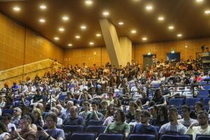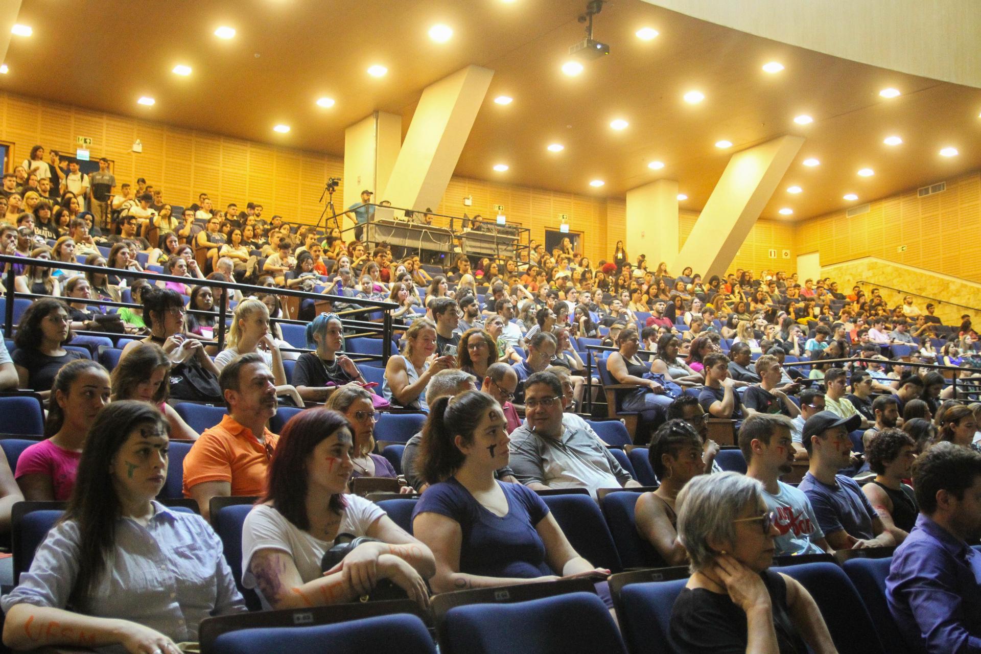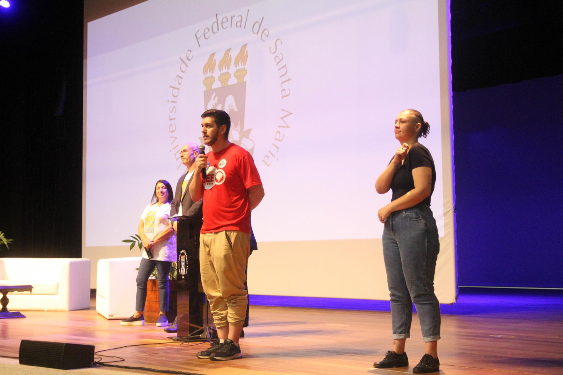 O coordenador geral do DCE, Daniel Ballin, começou falando sobre a relevância da universidade e sua referência no ensino, na pesquisa e na extensão. O representante ressaltou o apoio do diretório na recepção e acolhimento dos calouros. Também falou aos ouvintes acerca da importância de levantar pautas estudantis, de mercado de trabalho, bem como de melhorias no ensino. Daniel apresentou a programação da Calourada 2023 e instigou o apoio aos artistas locais que participarão do evento. “Será um evento popular de cultura para os estudantes”, disse. Ao fim, o representante do DCE convidou todos a participar de uma roda de debate sobre formas de ingresso na UFSM.