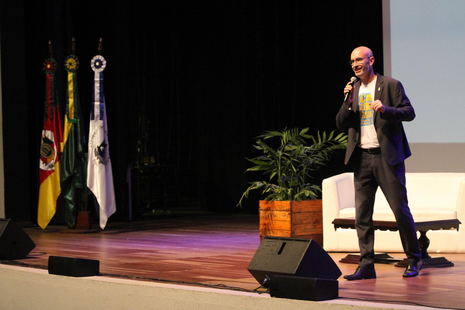 Sobre a chegada dos estudantes na universidade, o reitor Luciano Schuch destacou que a UFSM é feita por pessoas, por seu caráter acolhedor, receptivo, bem como celebrativo, com muita responsabilidade. O reitor falou sobre a nova etapa na vida de cada estudante e ressaltou que agora é um momento de busca pelo conhecimento, pela aprendizagem de novas áreas e pela descoberta de atuação. Ele fala também sobre o apoio que a UFSM oferece aos estudantes. “Existe toda uma estrutura de apoio para vocês. Apoio psicológico, psiquiátrico, esportivo, para que vocês consigam aproveitar o máximo possível a nossa universidade”, explica. No mesmo tema, o reitor destaca também a importância dos laços formados dentro do campus e a importância da ajuda que uma pessoa pode oferecer a outra. Dessa forma, o gestor encerra sua manifestação ao incentivar a defesa da universidade pública, gratuita e de qualidade. “Nós queremos só um país melhor, mais justo, e que todos possam participar dessa luta”, conclui.