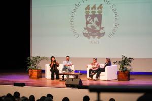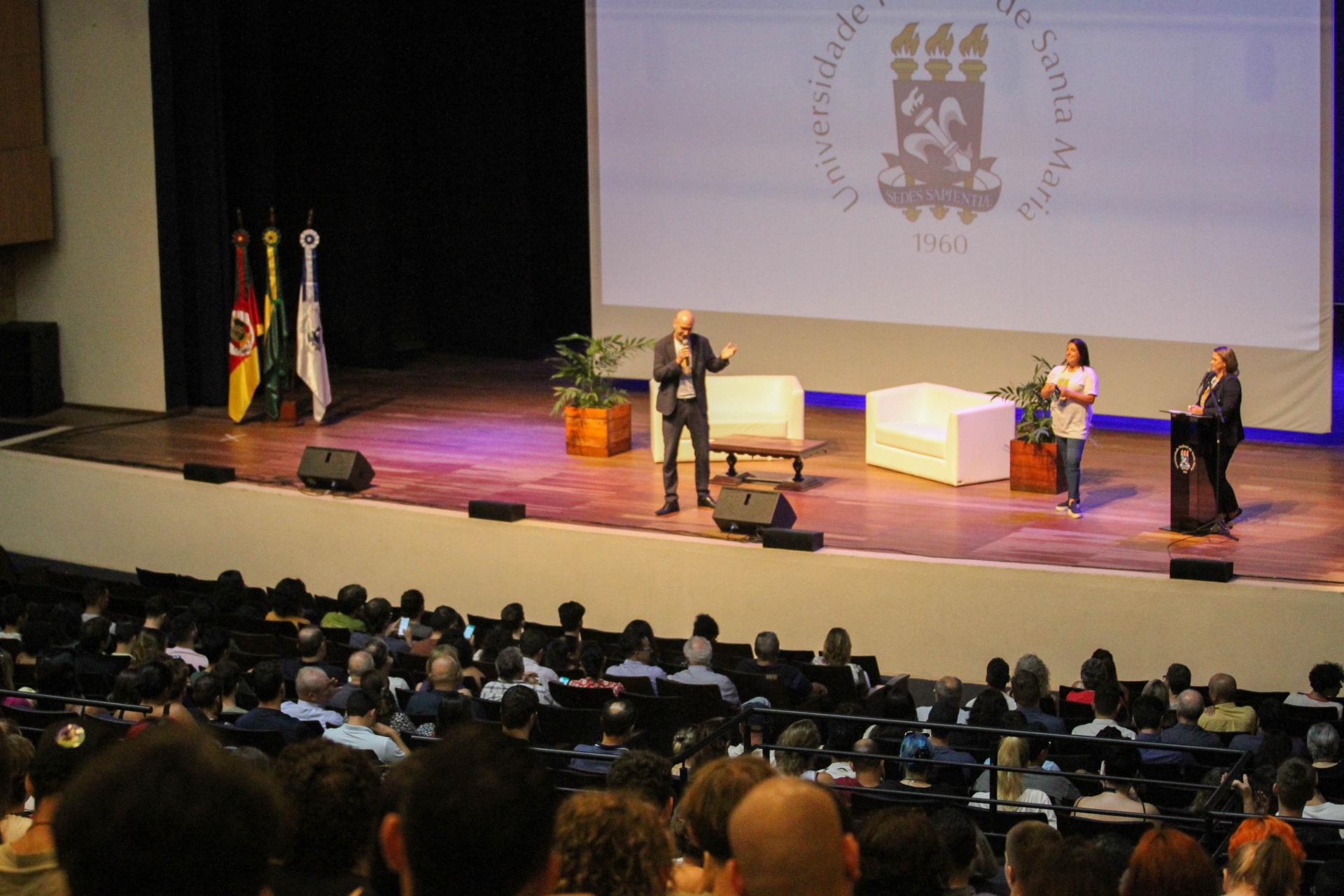 Às 10h desta segunda (20), ocorreu a recepção institucional no Centro de Convenções da UFSM. Organizado pela Pró-Reitoria de Assuntos Estudantis (Prae), Pró-Reitoria de Graduação (Prograd) e Gabinete do Reitor, o evento contou com manifestações do reitor Luciano Schuch, da vice-reitora Martha Adaime e do representante do Diretório Central dos Estudantes (DCE), Daniel Ballin. Houve também show musical e conversa com três egressos da UFSM: a cantora, compositora e professora de música, Dida Larruscain, egressa do Centro de Artes e Letras (CAL); o professor de Agronomia Gustavo Brunetto, egresso do Centro de Ciências Rurais (CCR); e a diplomata Ana Beltrame, que serviu em embaixadas do Brasil em diversos países e é egressa do Centro de Ciências Sociais e Humanas (CCSH).