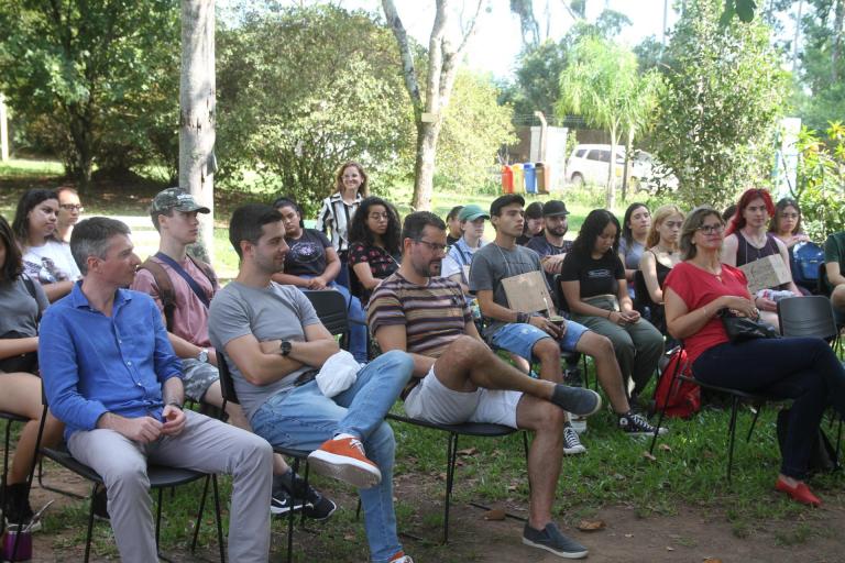 Na chegada, os novos alunos foram recebidos com música ao vivo. Depois ocorreu uma cerimônia ao ar livre que contou com manifestações de diferentes representantes do CCNE, como a coordenadora do Setor de Apoio Pedagógico, Eliane Cristina Amoretti, que falou sobre a importância do apoio de colegas, professores e demais setores do centro de ensino durante a graduação. A diretora do Jardim Botânico, Simone Messina, acolheu os calouros e compartilhou suas primeiras experiências na universidade, bem como os desafios e as oportunidades que teve durante a graduação. Ela também destacou o Jardim Botânico como um espaço de aprendizagem e de oportunidades para os estudantes.