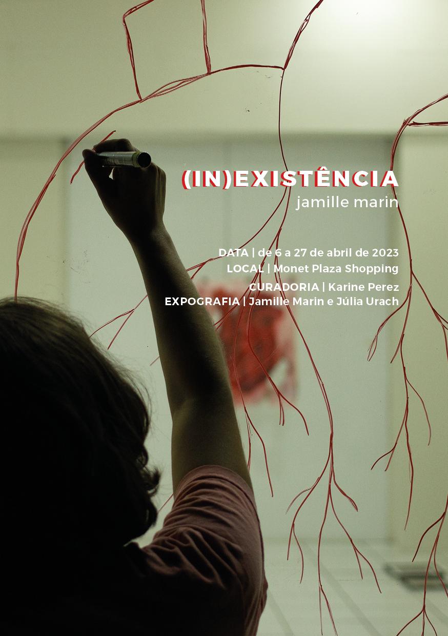A estudante do curso de Artes Visuais da UFSM Jamile Marin realiza a exposição individual “(In) Existência” até quinta-feira (27) na Sala Monet Plaza Arte, do Monet Plaza Shopping. Estão expostas pinturas, colagens, fotografias, uma instalação, uma intervenção em vidro (desenho) e uma intervenção no chão (poesia).