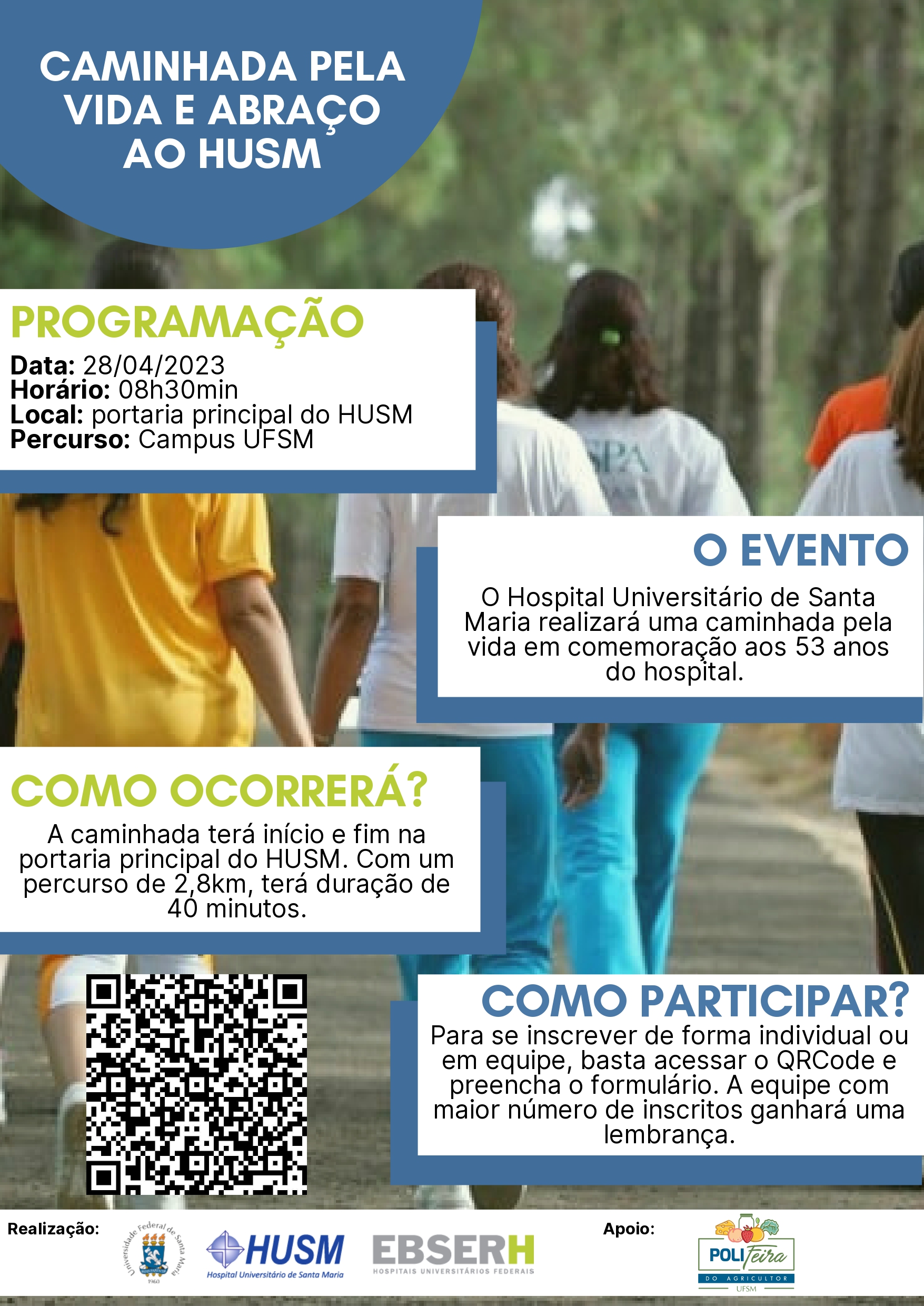 A caminhada terá início às 8h30, na portaria principal do hospital, e vai terminar no mesmo local. Os participantes vão realizar um percurso de 2,8 km pelo campus da UFSM, que terá duração de 40 minutos.