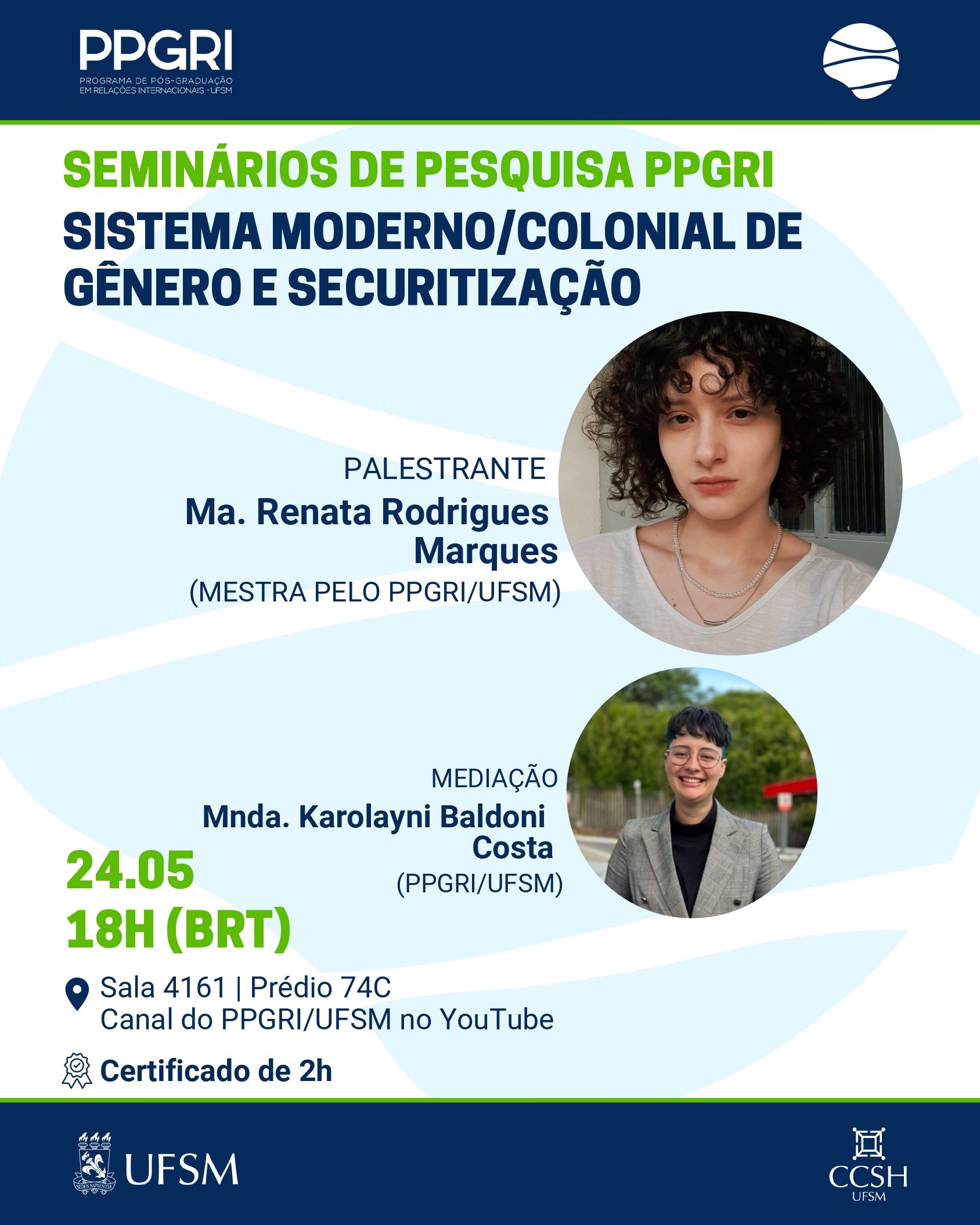 Na próxima quarta-feira (24), ocorre o 8º Encontro dos Seminários de Pesquisa do Programa de Pós-Graduação em Relações Internacionais da UFSM, que terá como tema “Sistema moderno/colonial de gênero e securitização”. A palestra será ministrada por Renata Rodrigues Marques, com a mediação de Karolayni Baldoni Costa, as quais são, respectivamente, mestra e mestranda pelo programa. A atividade começa às 18h, na sala 4161 do prédio 74C do campus sede, contando com transmissão via Youtube.