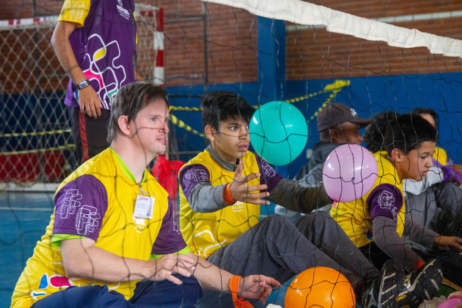 Outra modalidade foi o vôlei sentado. Divididos em duas equipes, o objetivo foi jogar os inúmeros balões coloridos para o lado adversário. Já o atletismo, realizado na pista, foi dividido em duas modalidades: a tradicional corrida e o arremesso – em que o desafio foi acertar pequenas bolas em circunferências redondas colocadas no chão.