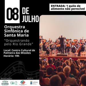 A Orquestra Sinfônica de Santa Maria vai se apresentar neste sábado (8) no município de Palmeira das Missões. O espetáculo começa às 19h, no Centro Cultural. O ingresso é um quilo de alimento não perecível.
