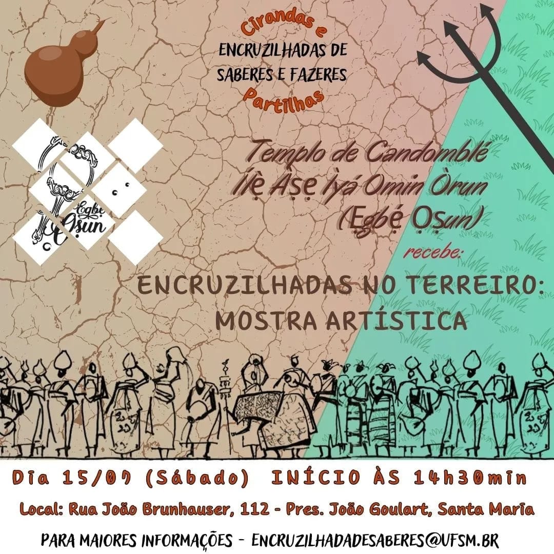O programa de extensão Encruzilhadas de Saberes e Fazeres: Cirandas e Partilhas retorna com mais um evento no próximo sábado (15), que desta vez não ocorrerá na universidade, mas no templo de candomblé Ílẹ̀ Àṣẹ Iyá Omin Òrun (Ẹgbẹ́ Ọṣun), contando com o acolhimento da Mãe Silvia de Ọṣun. A atividade em questão é a mostra artística Encruzilhadas no Terreiro, com início previsto para as 14h30min.