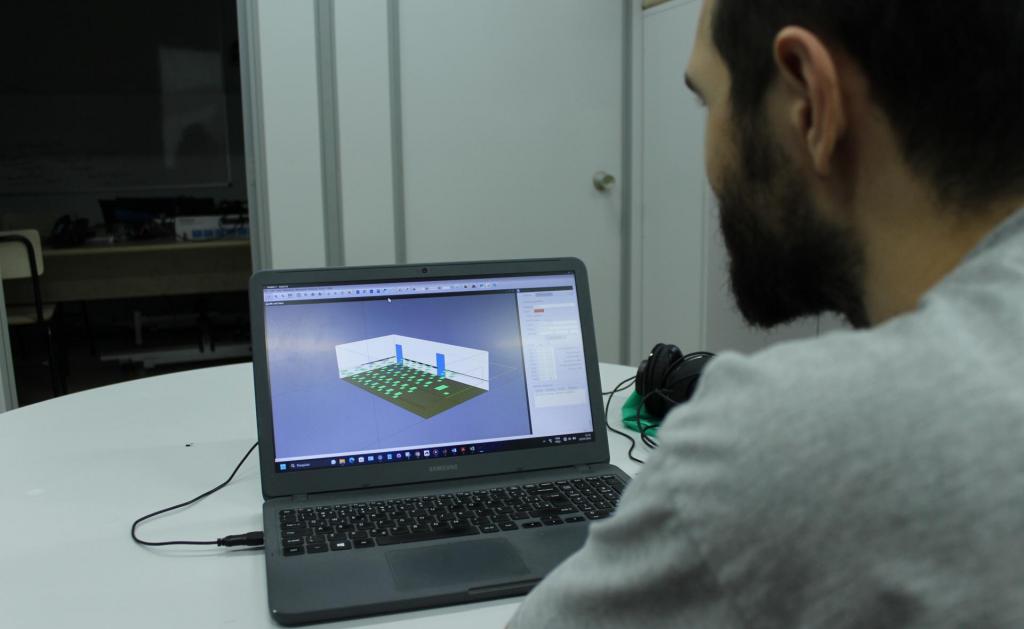 Após a definição de melhorias, foi produzida uma maquete eletrônica da sala, para realizar os testes com adição dos materiais. Nesta simulação computacional, serão alimentados os dados da sala e das propriedades dos diferentes materiais possíveis de serem utilizados. Então, a equipe irá analisar quais serão os materiais escolhidos para melhorar o condicionamento acústico da sala e atingir os parâmetros ideais.