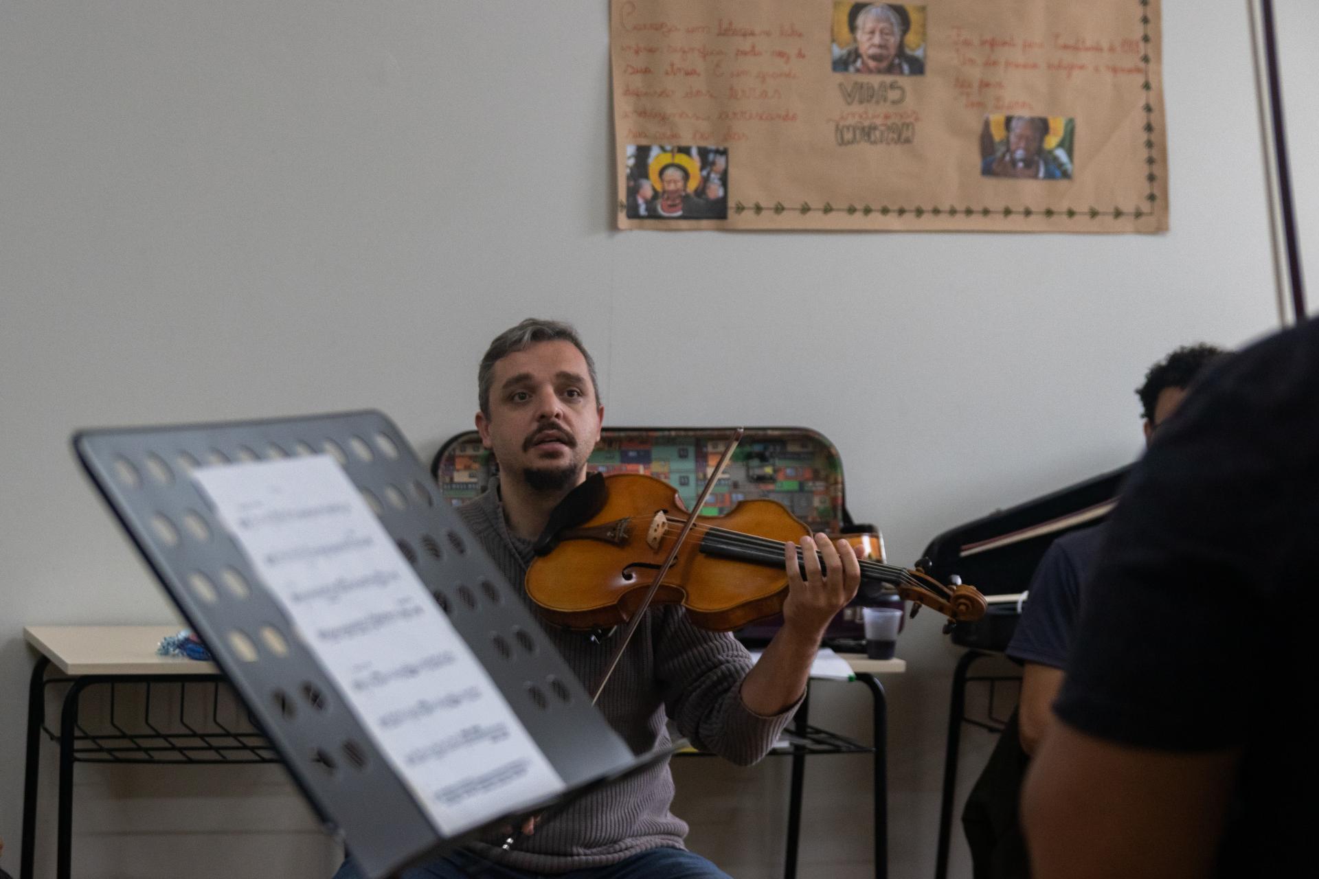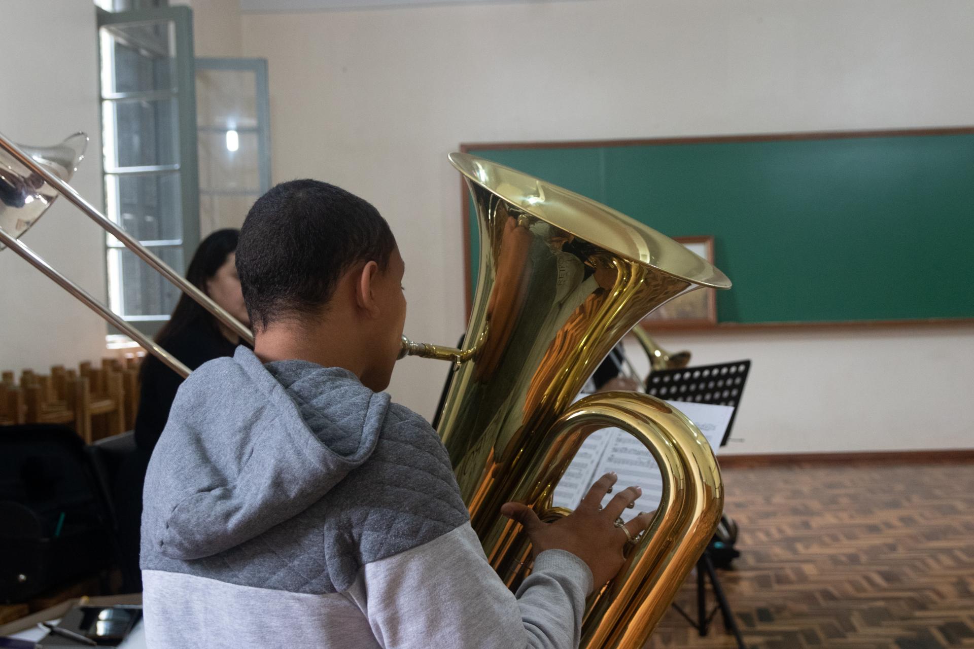 No mesmo prédio, o professor Daniel Silver, da University of Colorado, dos Estados Unidos, se arriscava no português para se comunicar com alunos na oficina de clarineta. Durante a aula, o som era reproduzido pelos alunos após o ensinamento do professor americano, que observava atentamente cada aluno presente. A alguns passos dali, na Escola Pe. Rafael Iop, as salas de aula do ensino fundamental deram espaço às oficinas de violoncelo e viola, por exemplo. Já no hotel, aconteciam as aulas de contrabaixo e violino, além da educação musical – oficina que destaca o ensino e a cultura por trás dos instrumentos.