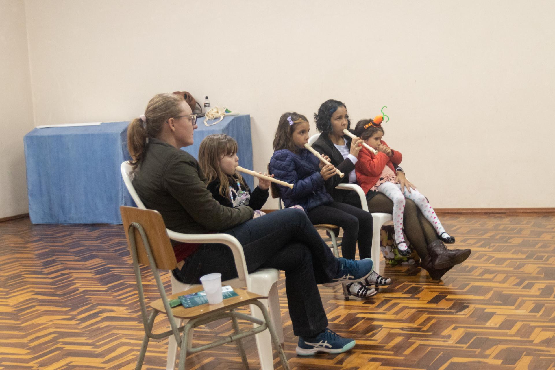 Sophia e Alice vieram para a aula acompanhadas da mãe, Cíntia Freitas. Apesar de nunca terem tido contato com o instrumento, as irmãs acompanharam com entusiasmo os ensinamentos da professora Fernanda e até arriscaram algumas notas na flauta. Cíntia conta que ouviu falar sobre o Festival em Santa Maria, cidade em que reside, e optou por conhecer o evento de perto com as filhas. “Eu sempre busco oportunizar para elas o que eu posso de arte e música. E quando eu vi as oficinas resolvi trazer. Está sendo muito bom ver elas gostando”, conta Cíntia.