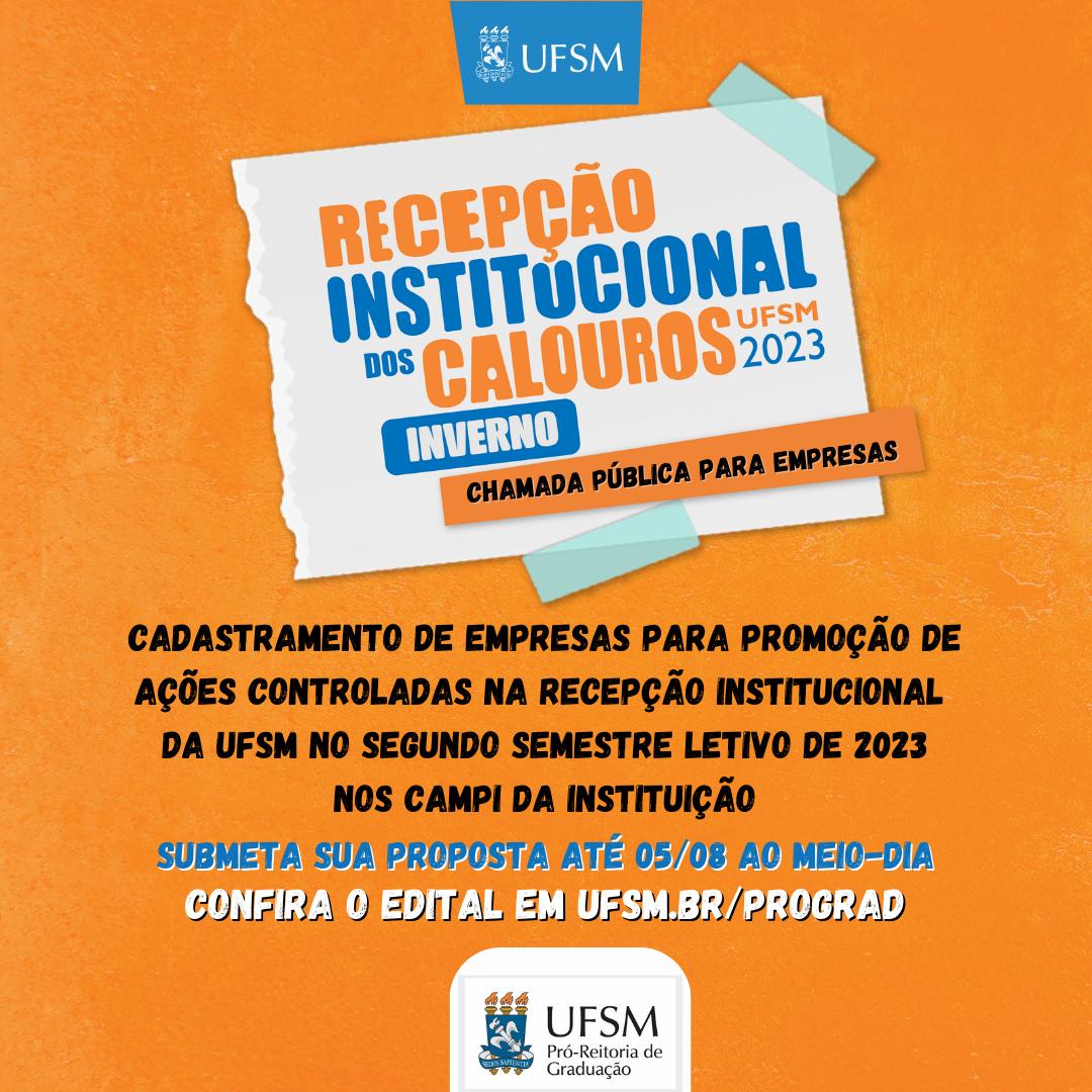 A Pró-Reitoria de Graduação (PROGRAD) da Universidade Federal de Santa Maria (UFSM) divulgou Chamada Pública para o cadastramento de empresas interessadas em desenvolver ações durante a semana da Recepção Institucional da UFSM aos calouros, em seus quatro campi: Santa Maria, Cachoeira do Sul, Frederico Westphalen, Palmeira das Missões.