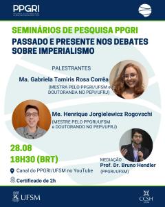O Programa de Pós-Graduação em Relações Internacionais da UFSM convida a comunidade acadêmica para o 10º Encontro dos Seminários de Pesquisa, que terá como tema “Passado e presente nos debates sobre imperialismo”. Sob a mediação do professor do programa Bruno Hendler, o encontro terá como painelistas dois egressos que obtiveram os títulos de mestre e bacharel em Relações Internacionais pela UFSM: Gabriela Tamiris Rosa Corrêa e Henrique Jorgielewicz Rogovschi. Em formato virtual, a atividade ocorre no dia 28 de agosto, às 18h30min, com transmissão no canal do programa no Youtube. Os participantes do encontro vão ganhar certificado.