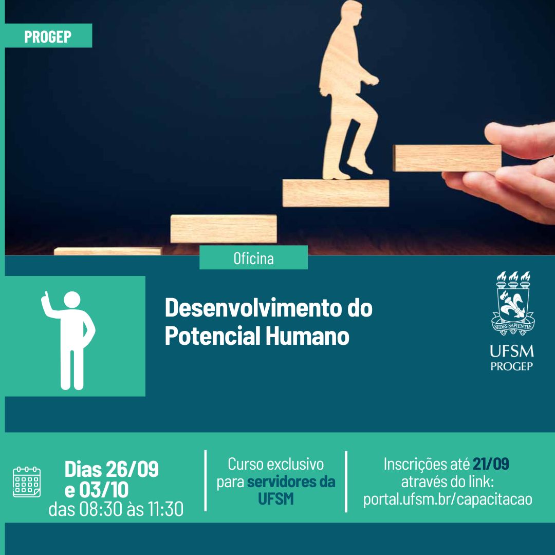 Estão abertas as inscrições para a oficina Desenvolvimento do Potencial Humano, que tem como objetivo proporcionar aos participantes uma perspectiva sobre o futuro, por meio de uma imersão no processo de autoconhecimento, de forma adequada e inspiradora, que lhes permita tomar decisões mais acertadas e ampliar suas opções de estilo de vida e carreira.