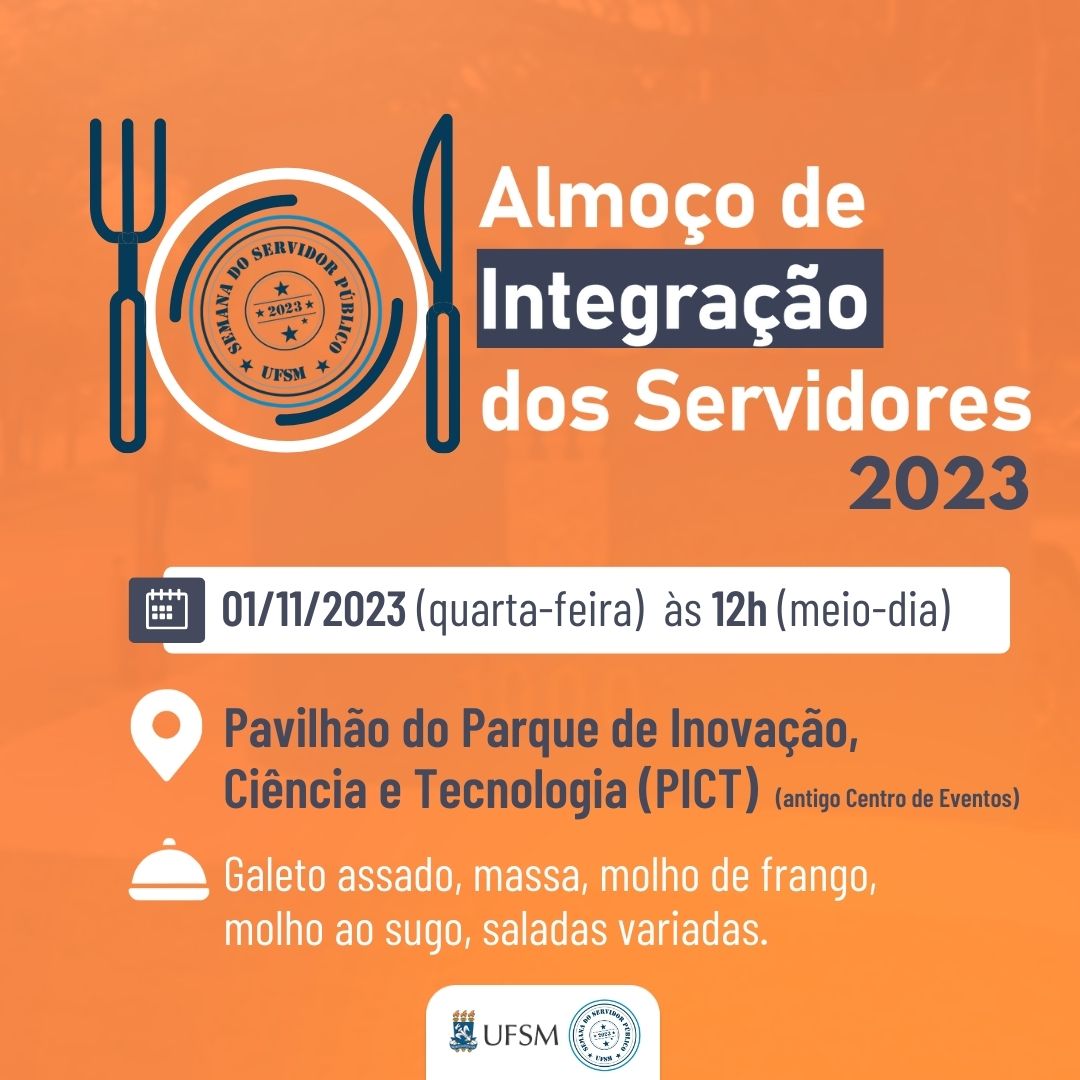 A Pró-Reitoria de Gestão de Pessoas (Progep) informa que estão à venda no Núcleo de Educação e Desenvolvimento (NED) – ao custo de R$ 25,00 – os ingressos para o Almoço de Integração dos Servidores, que integra a programação da Semana do Servidor Público da UFSM 2023. O almoço ocorre no dia 1º de novembro, ao meio-dia, no pavilhão do Parque de Inovação, Ciência e Tecnologia (antigo Centro de Eventos). O cardápio consiste em galeto assado, massa, molho de frango, molho ao sugo e saladas variadas. O NEP localiza-se na sala 433 (4º andar) da Reitoria.