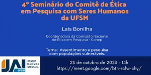 O Comitê de Ética em Pesquisa com Seres Humanos da UFSM tem por objetivo garantir a proteção dos participantes das pesquisas, especialmente no que diz respeito à integridade, dignidade, privacidade, anonimato, sigilo e confidencialidade dos dados, preservando-se, deste modo, os seus direitos. Na próxima segunda-feira (23), às 14h, ocorre a 4ª edição do seminário do comitê, que terá como tema “Assentimento e pesquisa com populações vulneráveis”. O assunto será abordado pela professora Laís Bonilha, que é docente do curso de Fisioterapia da Universidade Federal de Mato Grosso do Sul, além de coordenadora da Associação Brasileira de Ensino em Fisioterapia (Abenfisio) e coordenadora da Comissão Nacional de Ética em Pesquisa (Conep).