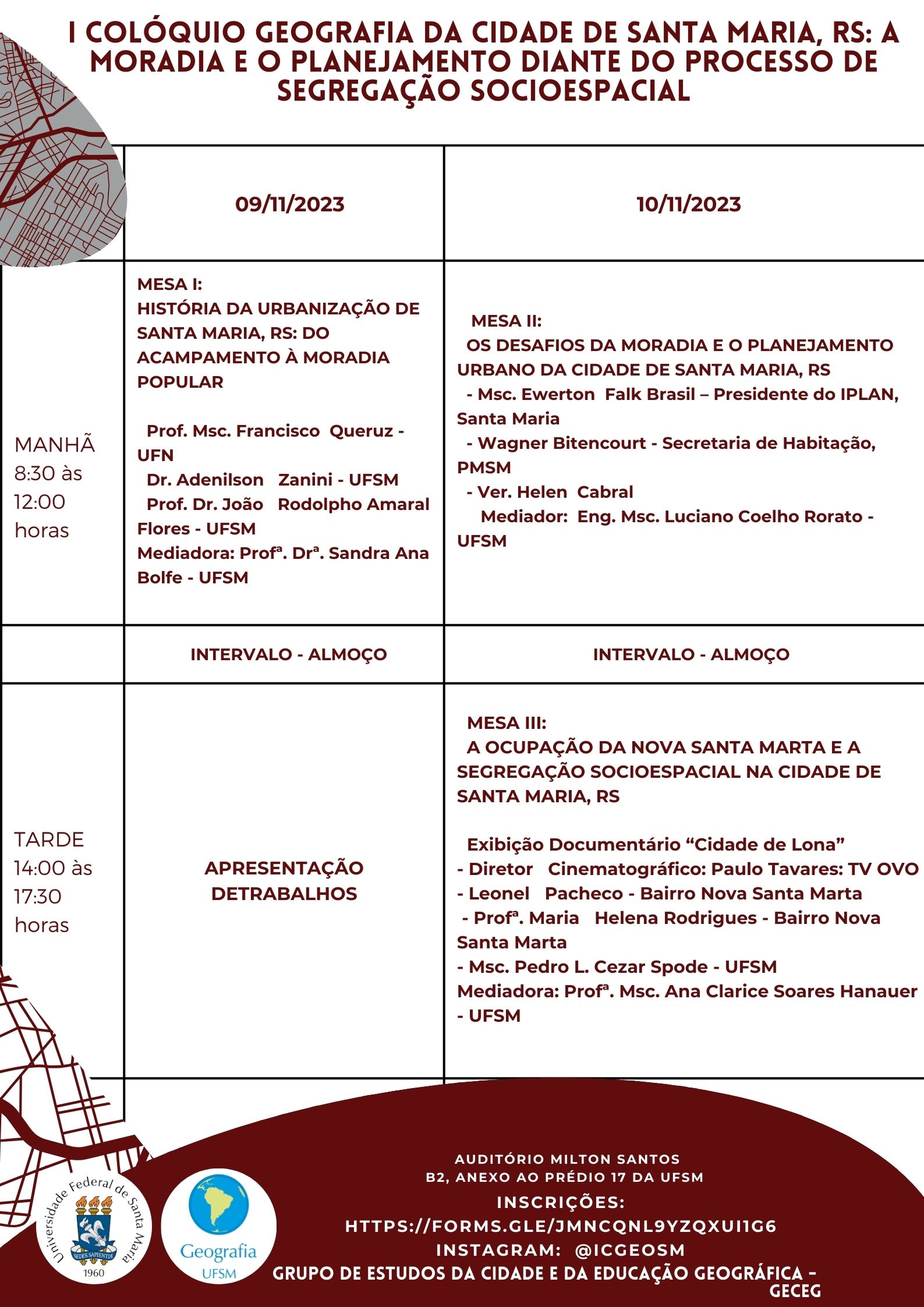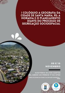 Vinculado ao curso de Licenciatura em Geografia da UFSM, o Grupo de Estudos da Cidade e da Educação Geográfica convida a comunidade a participar, nos dias 9 e 10 de novembro, do 1º Colóquio de Geografia da Cidade de Santa Maria, que tem como tema “A moradia e o planejamento diante do processo de segregação socioespacial”. Seu objetivo é refletir sobre os desafios enfrentados pela cidade com relação à organização territorial e os efeitos da urbanização sem o devido planejamento. O colóquio ocorre no Auditório Milton Santos (B2) – anexo ao prédio 17 do campus sede. A programação é constituída por mesas de debate e apresentação de trabalhos.