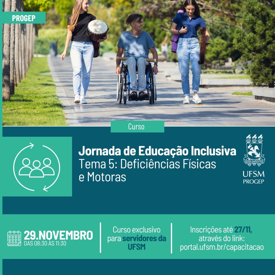 Estão abertas as inscrições para a 5ª ação de desenvolvimento da Jornada de Educação Inclusiva. O próximo tema a ser abordado será “Deficiências Físicas e Motoras”, que será conduzido pela instrutora Suzel Lima da Silva.