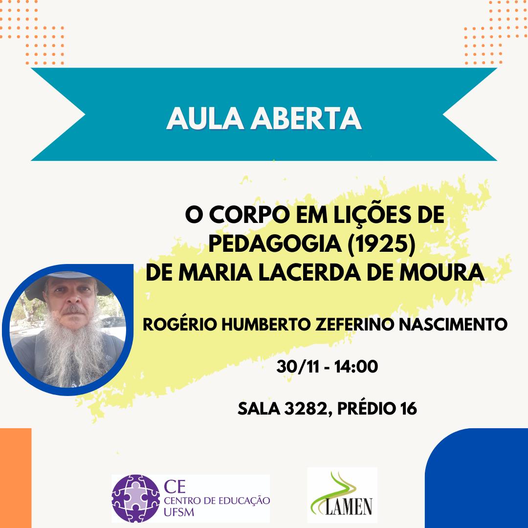Os Laboratórios de Metodologia do Ensino (Lamen) da UFSM promovem nesta quinta-feira (30) uma aula aberta com o título “O corpo em Lições de Pedagogia (1925) de Maria Lacerda de Moura”. O palestrante será o professor Rogério Humberto Zeferino Nascimento, da Universidade Federal de Campina Grande (UFCG). Ele vai abordar a obra teórica da escritora e professora Maria Lacerda de Moura, com destaque para as concepções educacionais que ela expôs no livro mencionado no título da aula aberta, que começa às 14h na sala 3282 do Centro de Educação (CE) – prédio 16 do campus sede. Não há necessidade de inscrição prévia para assistir à palestra.