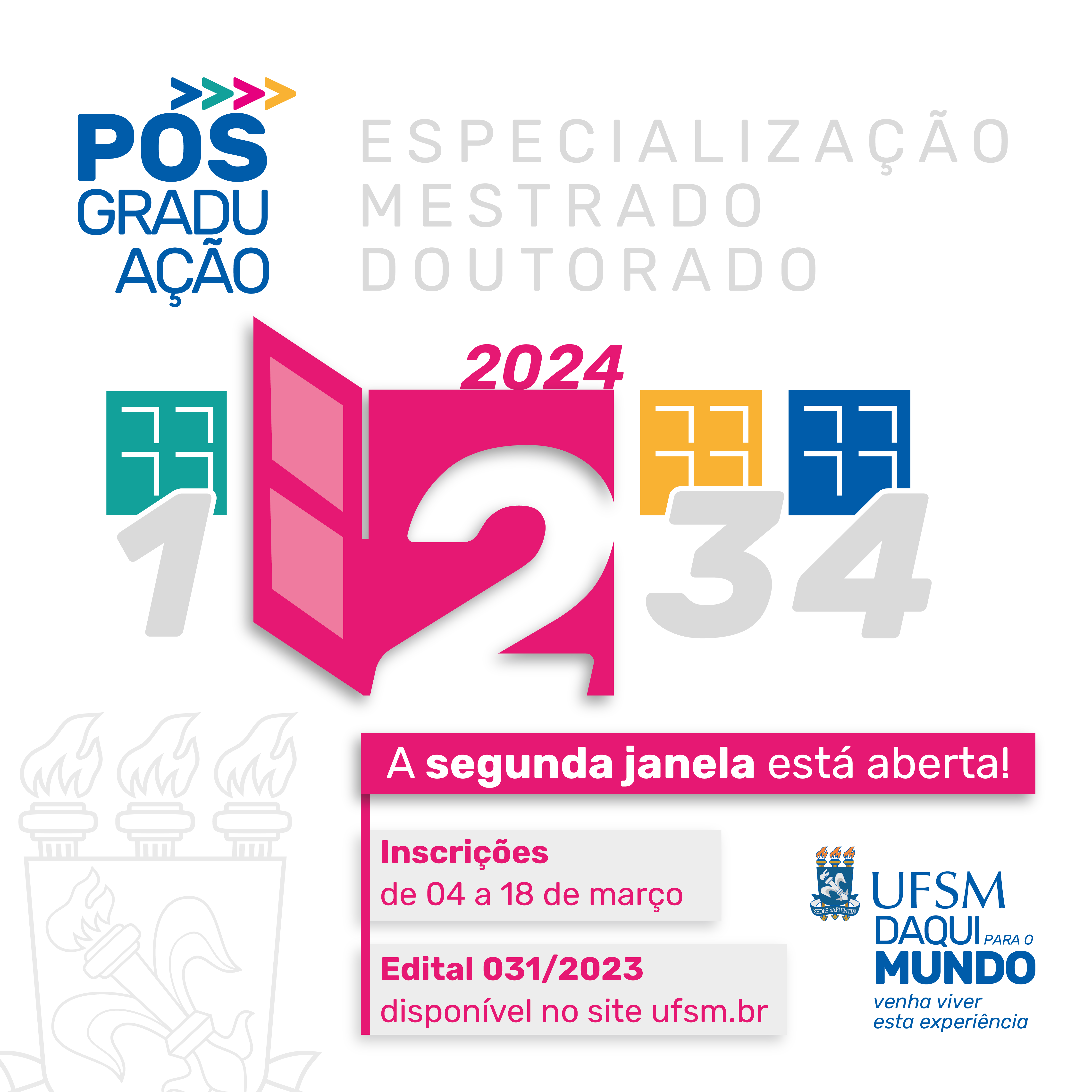 A 2ª janela de seleção e ingresso na pós-graduação da UFSM está aberta de 4 a 18 de março. São oferecidas mais de 250 vagas para mestrado, doutorado e especialização, com início das atividades acadêmicas previsto para maio de 2024.