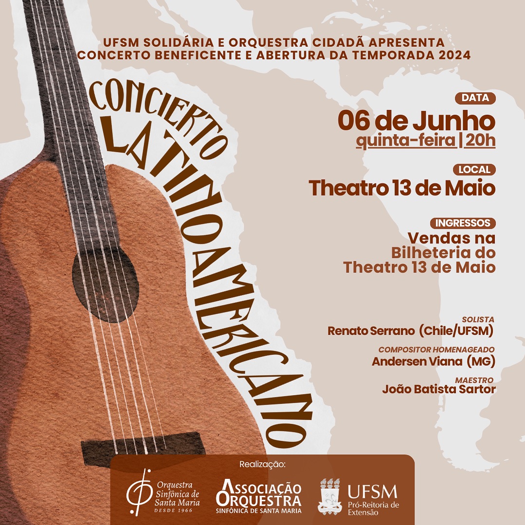 Em razão das inundações que atingiram o Rio Grande do Sul nas últimas semanas, a Orquestra Sinfônica de Santa Maria não pode apresentar o espetáculo “Concierto Latinoamericano” na data original (30 de abril). No entanto, o concerto foi remarcado para o dia 6 de junho, às 20h, no Theatro Treze de Maio. A renda obtida com a venda dos ingressos será revertida em sua totalidade para entidades que atuam na assistência a pessoas afetadas pelas chuvas.