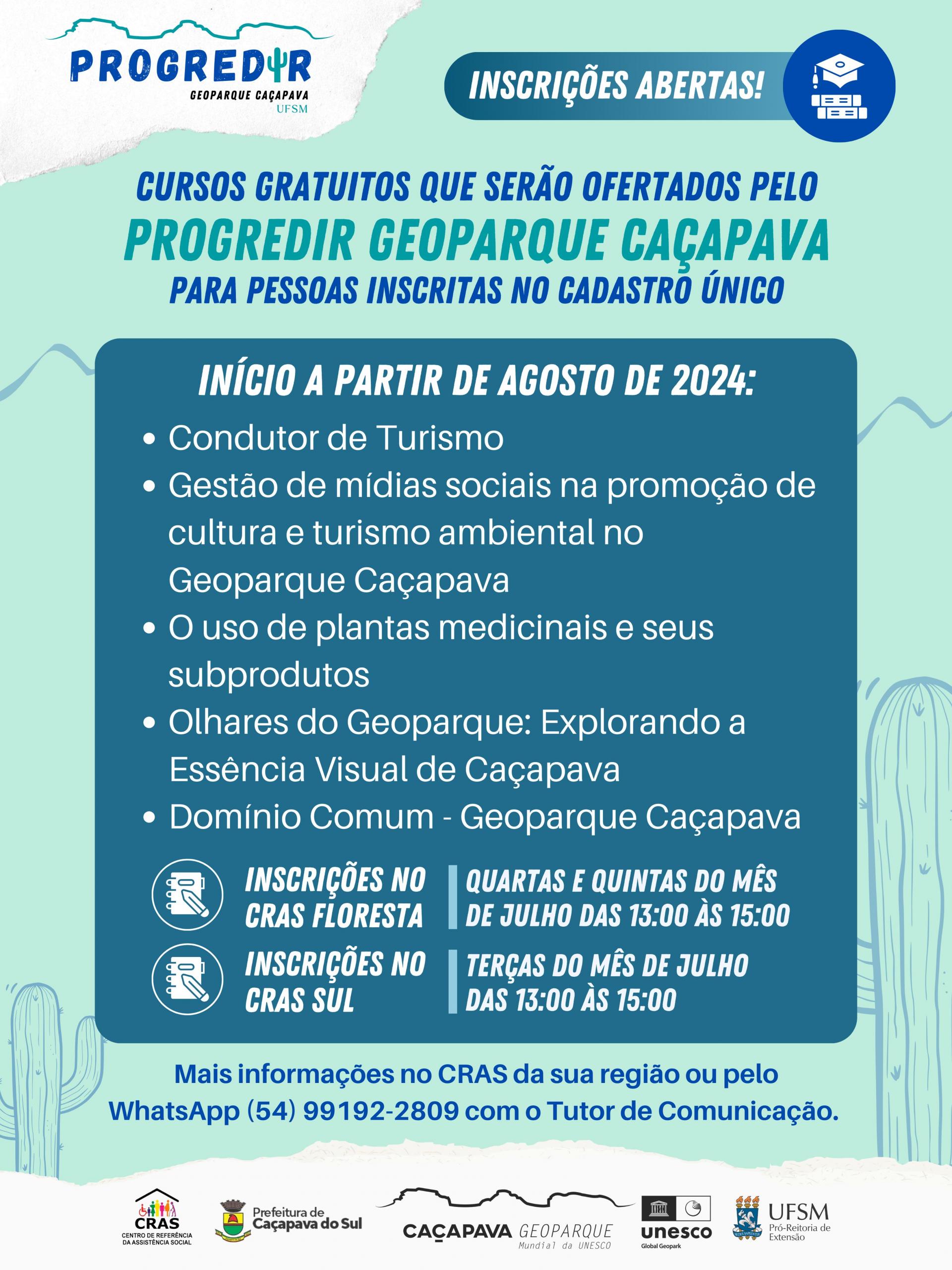 Estão abertas as inscrições para os cursos gratuitos do Progredir Geoparque Caçapava, destinados às pessoas inscritas no Cadastro Único do município. A iniciativa conjunta entre a Pró-Reitoria de Extensão da UFSM, a Prefeitura Municipal e os Centro de Referência da Assistência Social (Cras) de Caçapava do Sul, e com o apoio do Ministério de Desenvolvimento Social, Família e Combate à Fome (MDS), oferece qualificação profissional e pessoal em diversas áreas do conhecimento. Cada curso terá uma carga horária de 52 horas, com início previsto para agosto e outubro deste ano.