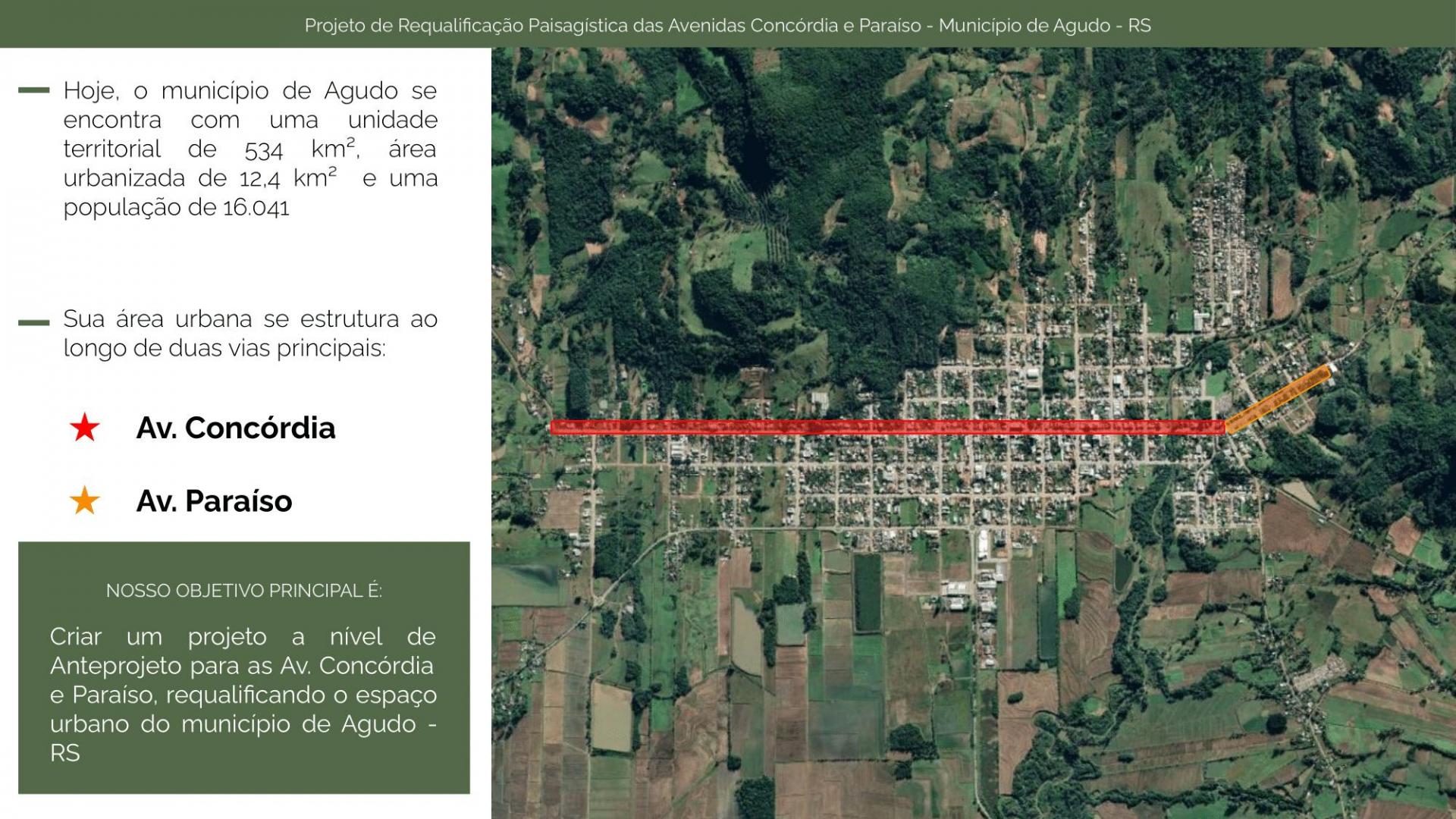 O projeto de extensão Requalificação Paisagística da UFSM apresentou para representantes da Prefeitura de Agudo a proposta de renovação das avenidas Concórdia e Paraíso, na manhã desta sexta-feira (19), no auditório do curso de Arquitetura e Urbanismo, no campus sede. O projeto tem como objetivo transformar as principais avenidas do município em um espaço público de lazer, interação e integração social, além de valorizar o patrimônio cultural local, como a Paróquia São Bonifácio e a Casa Charlotte, construída em estilo colonial no século 19 e que hoje abriga o museu do Instituto Cultural Brasileiro Alemão da cidade.