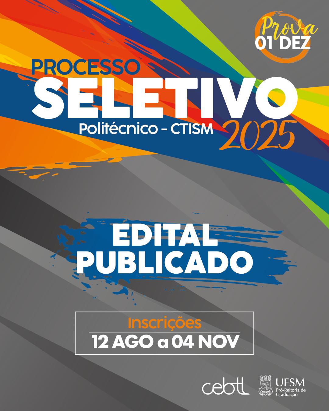 Estão abertas as inscrições dos processos seletivos para ingresso em 2025 no Colégio Politécnico e no Colégio Técnico Industrial de Santa Maria (Ctism). As inscrições vão desta segunda-feira (12) até o dia 4 de novembro de 2024 e os candidatos devem acessar o site do processo seletivo para ter acesso ao link de inscrições. Nesse link, é possível baixar os editais e manuais do processo seletivo, documentos importantes que precisam ser lidos na íntegra para conhecimento de todos os procedimentos e cumprimento de todas as etapas.