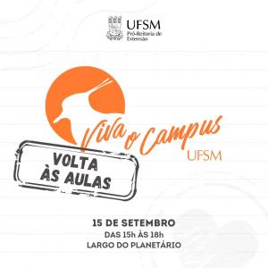 A UFSM, por meio da Pró-Reitoria de Extensão (PRE), promove no próximo domingo (15) o Viva o Campus especial de Volta às Aulas, em celebração ao início do segundo semestre letivo. O evento acontece a partir das 15h, contando com a presença, entre outras atrações, da Polifeira do Agricultor e do Projeto Arte Além do Ofício, no largo do Planetário. No mesmo local, começa às 16h o Sambari Festival, que terá a presença da Banda Lou Dog e DJ Bruneres.