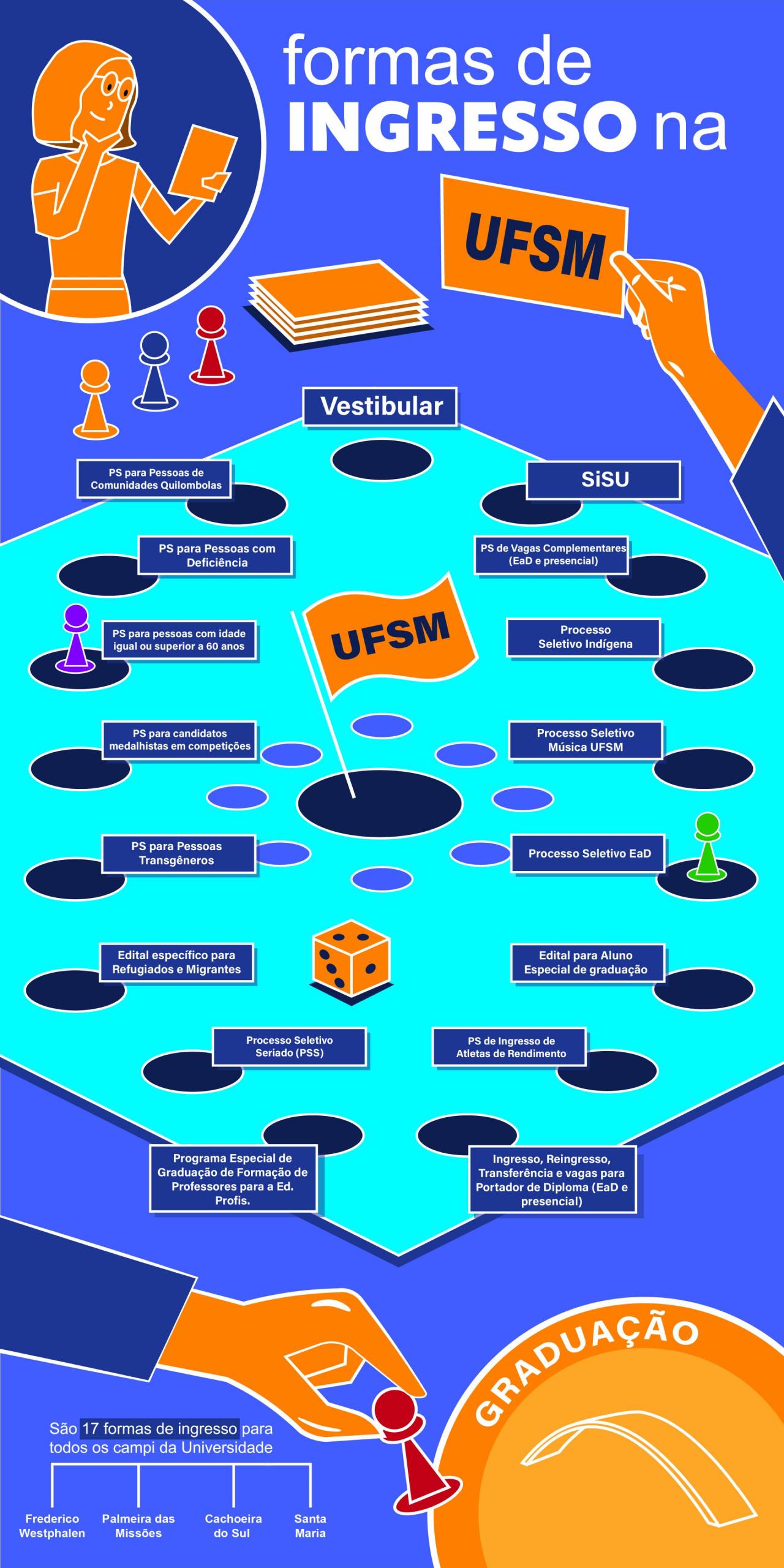 Além do Sistema de Seleção Unificada (SiSU), nos últimos anos a forma mais conhecida de ingresso nas universidades públicas brasileiras, a UFSM passou a contar com outros 16 diferentes processos para a entrada de novos estudantes. Junto com o retorno do Vestibular, com edição extraordinária em julho de 2023 e em definitivo em janeiro deste ano, a Universidade abriu diferentes processos seletivos para situações específicas.