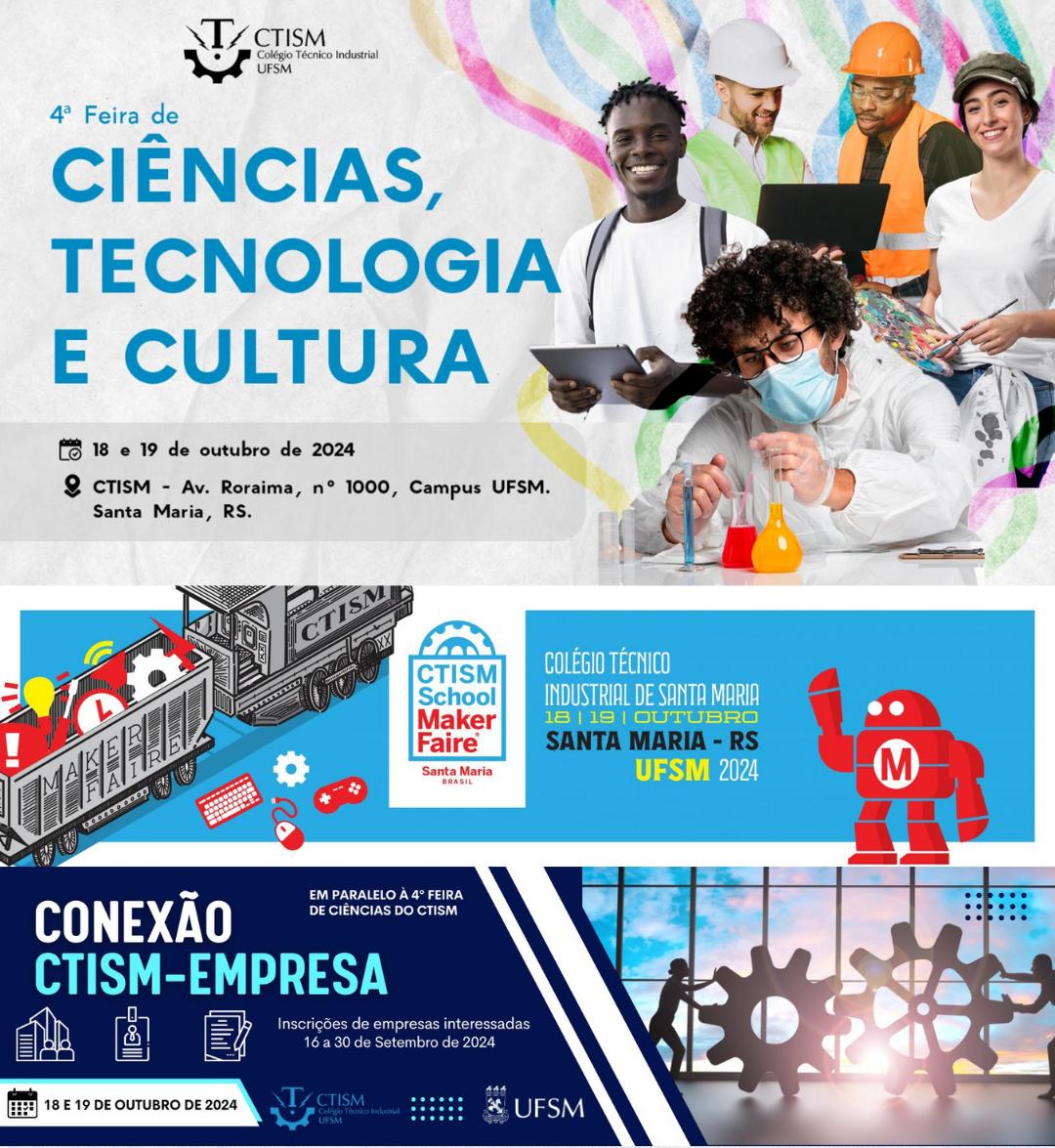 O Colégio Técnico Industrial de Santa Maria (Ctism) vai receber a comunidade para três eventos simultâneos (que vão acontecer nos prédios 5C, 5D e 5E) na sexta-feira (18) e sábado (19). No primeiro dia, o horário de visitação é das 8h30min às 12h e das 13h30min às 17h; no segundo dia, é das 8h30min às 11h30min. Um breve resumo dos eventos pode ser conferido abaixo.