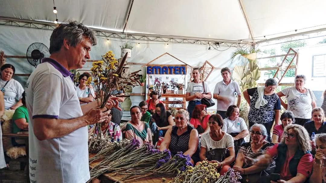 “Na oficina de arte floral, apresentamos as técnicas mais modernas internacionais de confecção de buquês com flores secas e frescas, buquê de noiva, arranjos para centro de mesa e arranjos para decoração de grandes ambientes como hall de entrada de hotéis e salões de festas”, explicou professor Nereu. Vários grupos de excursões, incluindo agricultores e agricultoras do Projeto Flores para Todos, participaram da oficina com perguntas e muita interação.