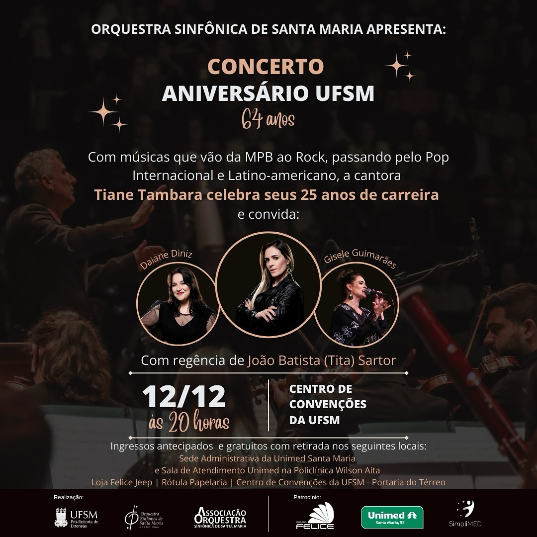 A UFSM completa 64 anos de existência no próximo sábado (14). Integrando a programação especial em celebração à data, a Orquestra Sinfônica de Santa Maria apresenta nesta quinta-feira (12), às 20h, o concerto “Aniversário UFSM”. Com um repertório que engloba gêneros como MPB, rock e pop internacional, o concerto também celebra os 25 anos de carreira da cantora Tiane Tambara, que concilia a vida artística com o trabalho como nutricionista no Restaurante Universitário. No espetáculo, ela vai dividir o palco do Centro de Convenções com outras duas cantoras conhecidas do público santa-mariense: Gisele Guimarães (que é pró-reitora de Assuntos Estudantis) e Daiane Diniz. Com regência do professor e maestro João Batista Sartor, o concerto contará com arranjos de Sólon Albuquerque, professor da Universidade Federal do Recôncavo da Bahia e egresso dos cursos de Música da UFSM.
