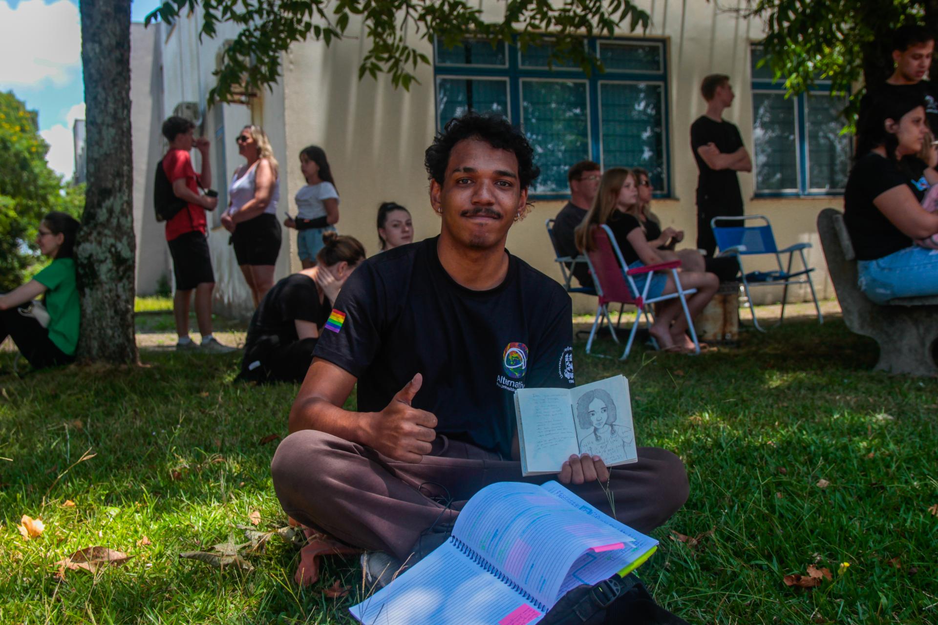 Enquanto desenhava e revisava os conteúdos de prova, o vestibulando de Psicologia Igor Trindade, 23 anos, natural de Santa Maria, comentou sobre a sua trajetória de estudos até o momento do exame. “A minha caminhada foi tranquila, eu fiz parte do Alternativa, um curso preparatório popular vinculado à UFSM, e com esse apoio consegui criar uma rotina de estudos bem estruturada”, descreve. Apesar do nervosismo, o estudante afirma estar confiante para a realização das questões. “Tenho boas expectativas, aproveitei o tempo antes da prova para revisar alguns conteúdos e fazer alguns desenhos para relaxar”, acrescenta Igor.
