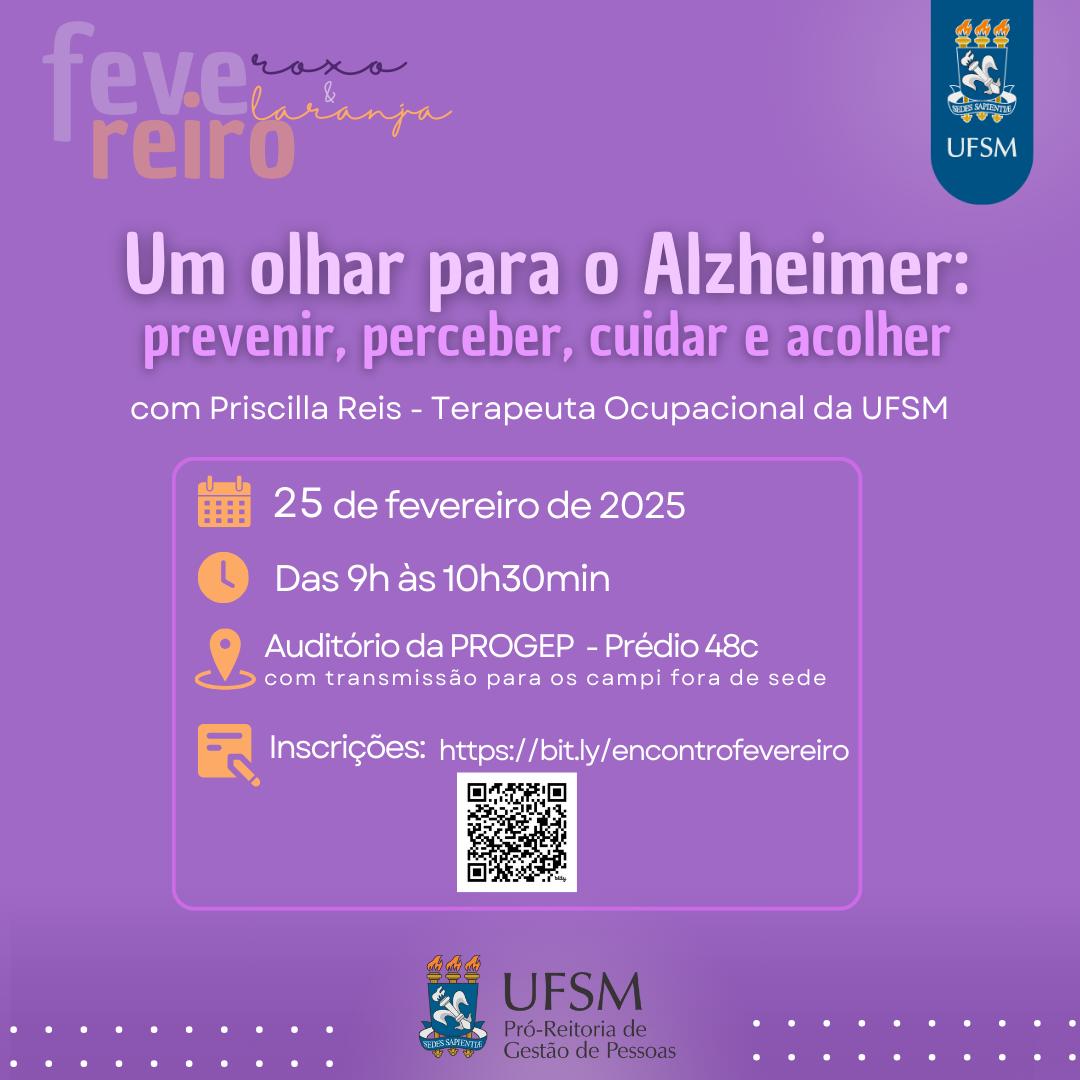 Nesta terça-feira (25), a Coordenadoria de Saúde e Qualidade de Vida do Servidor – órgão vinculado à Pró-Reitoria de Gestão de Pessoas (Progep) – promove o encontro intitulado “Um olhar para o Alzheimer: prevenir, perceber, cuidar e acolher”. Alusivo à campanha Fevereiro Roxo e Laranja, o encontro começa às 9h, no auditório da Progep, localizado no prédio 48C do campus sede (ao lado do CPD). A atividade será conduzida pela terapeuta ocupacional da UFSM Priscilla de Oliveira Reis, que abordará aspectos relacionados à prevenção do Alzheimer e promoção da qualidade de vida do paciente e familiares.
