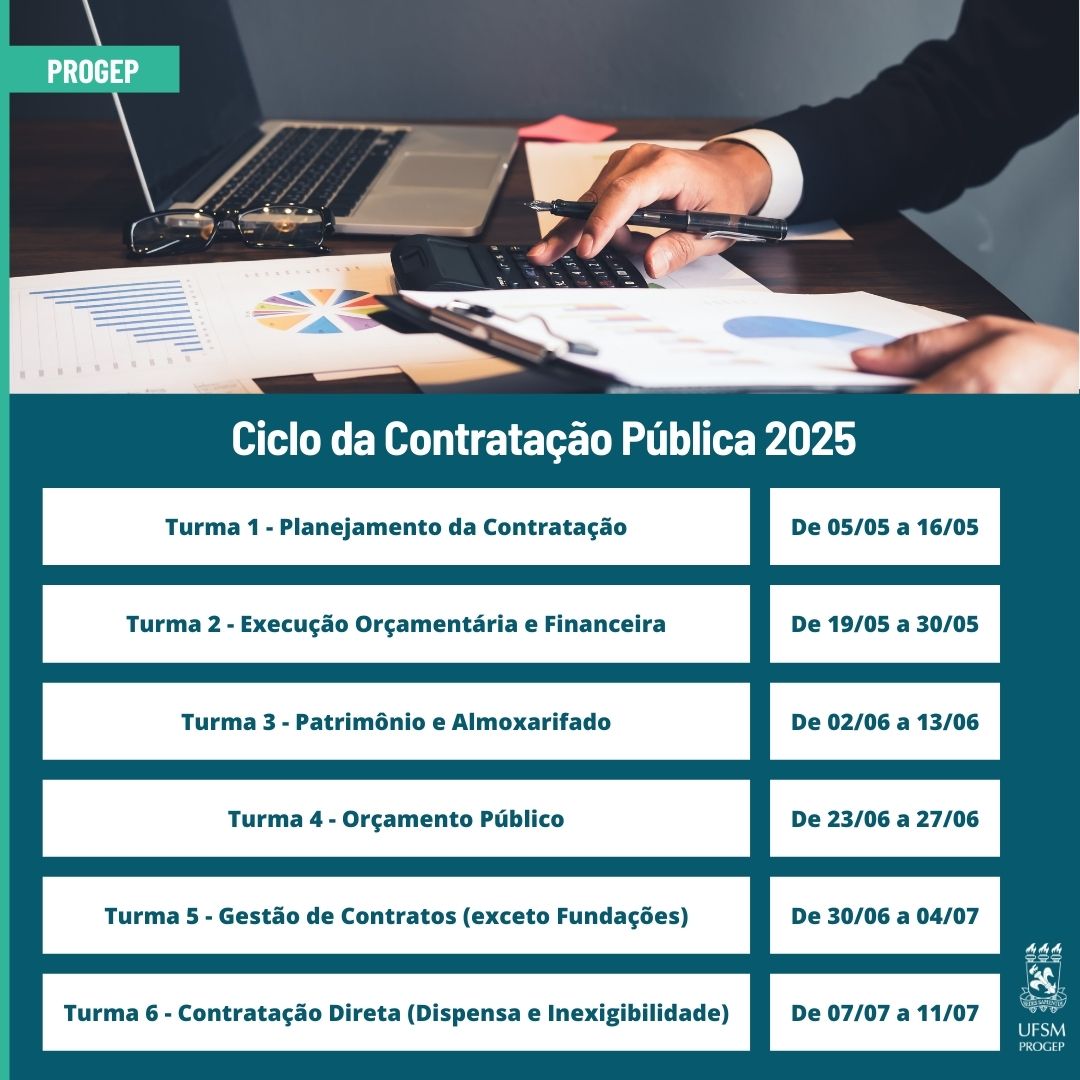 A Pró-Reitoria de Gestão de Pessoas (Progep) promove o Ciclo da Contratação Pública, que aborda diferentes áreas e está dividido em seis turmas, conforme a imagem ao lado. Desta segunda-feira (7) até o dia 28 de abril, estão abertas as inscrições para a turma 1, sobre “Planejamento da contratação”. Nela serão abordados temas como documentação para a instrução processual da fase preparatória das licitações e atuação nas sessões públicas (análise das propostas, julgamento e habilitação e recursos).