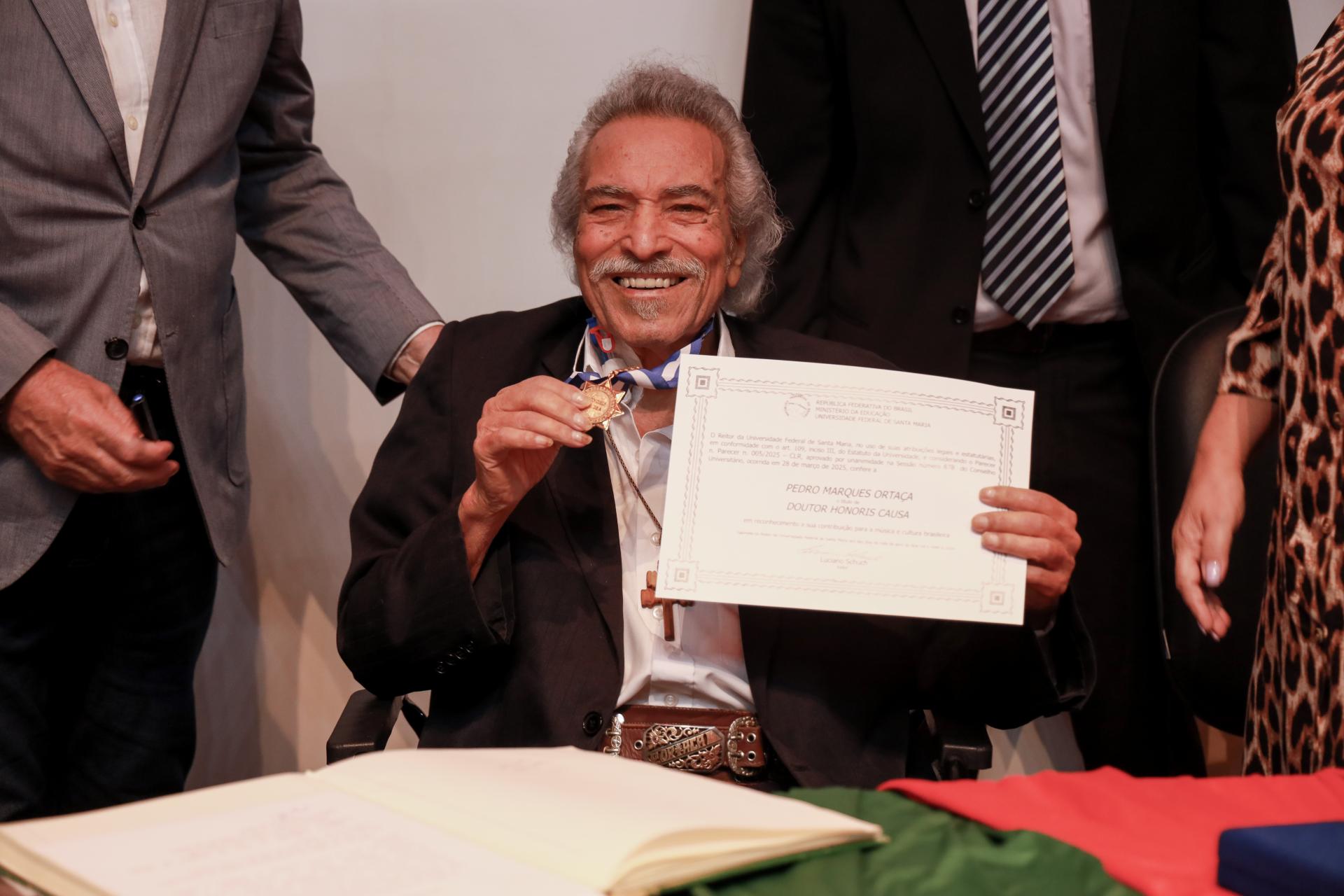 Nesta quinta-feira (10), a UFSM concedeu o título de Doutor Honoris Causa ao cantor, compositor e violonista missioneiro Pedro Ortaça. A cerimônia ocorreu à tarde, no Centro de Convenções, e contou com a presença de professores, técnico-administrativos em educação e estudantes, além de representantes de câmaras de vereadores, prefeituras e secretarias de educação.
