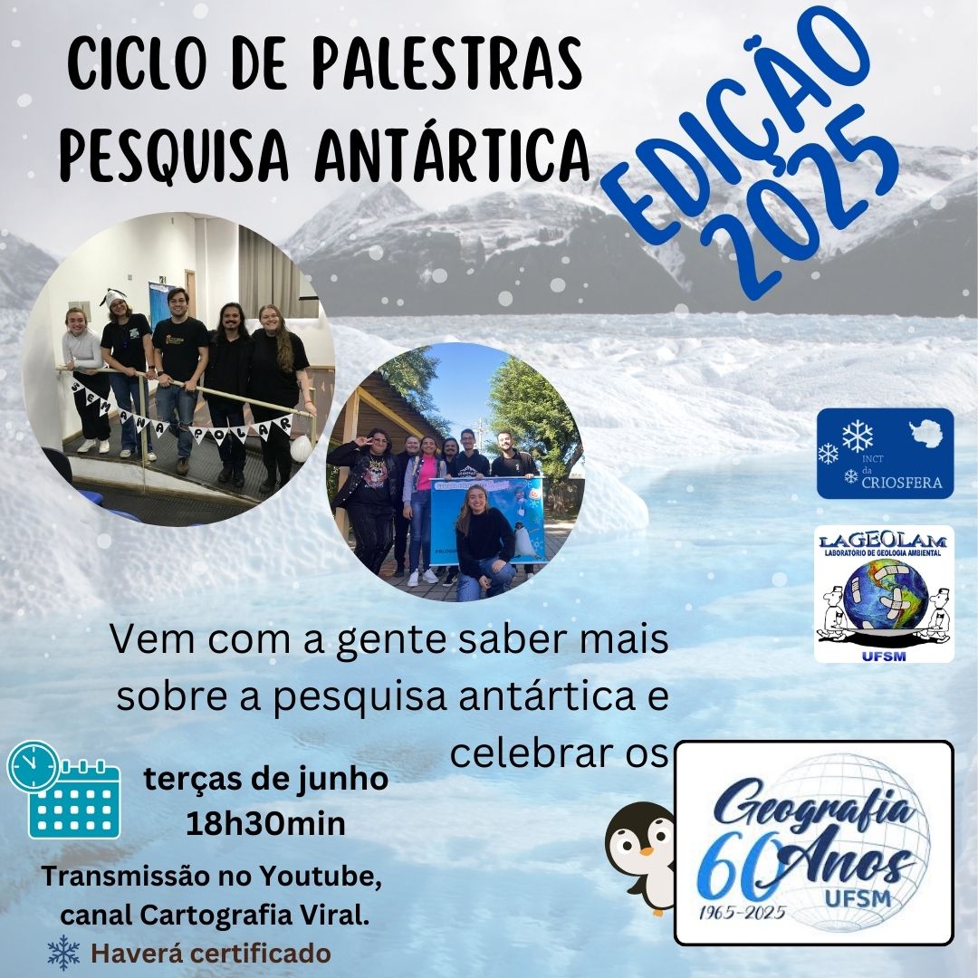 Integrando a programação que celebra os 60 anos do curso de Licenciatura em Geografia da UFSM, ocorre em junho deste ano mais uma edição do ciclo de palestras antárticas. Serão quatro conferências via Youtube, nas terças-feiras, às 18h30min, no canal Cartografia Viral. A relação dos temas que serão abordados e os respectivos palestrantes podem ser conferidas abaixo.
