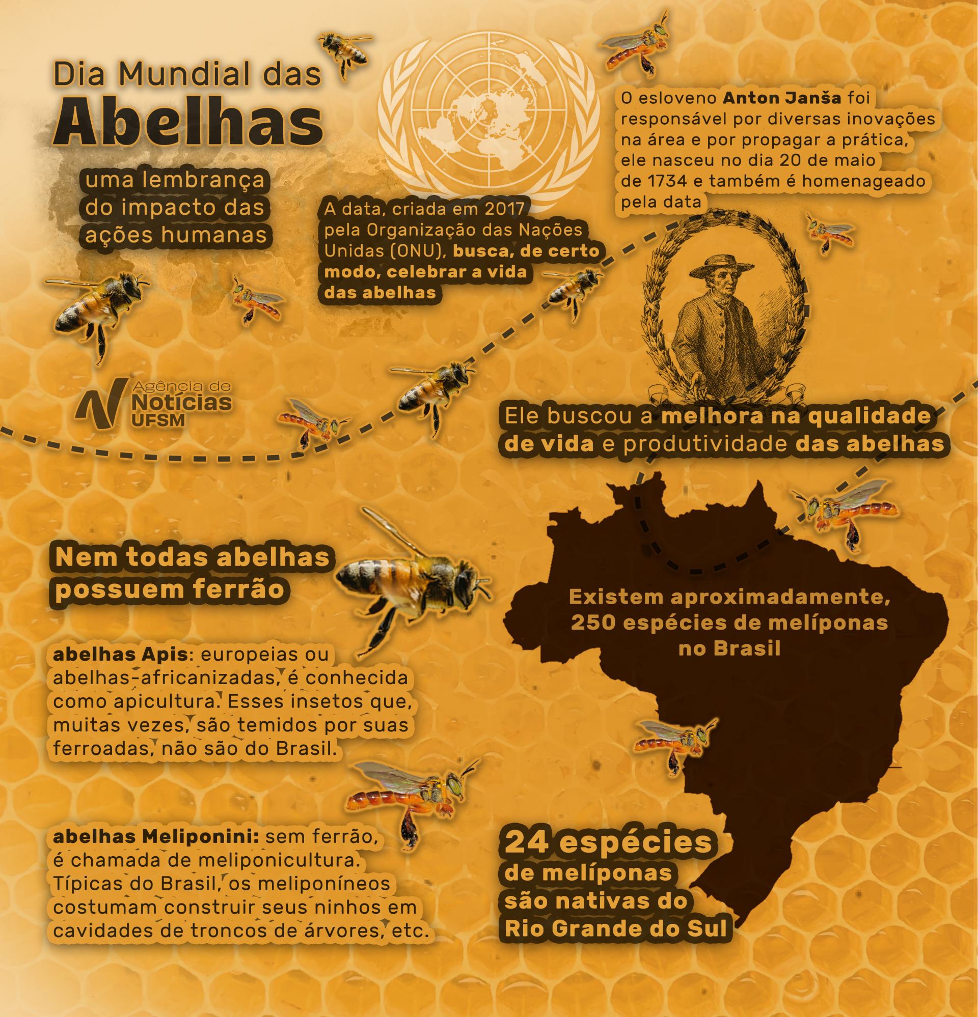 O Dia Mundial das Abelhas é comemorado nesta terça-feira, 20 de maio. A data, criada em 2017 pela Organização das Nações Unidas (ONU), busca, de certo modo, celebrar a vida das abelhas, lembrar a população da importância e conscientizar sobre os perigos da perda desses insetos.