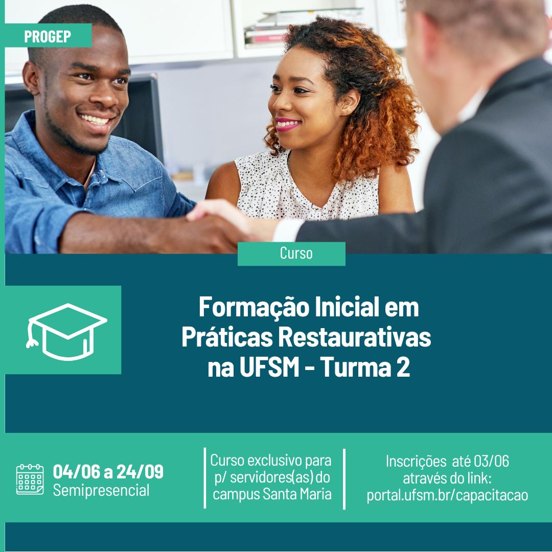 A Pró-Reitoria de Gestão de Pessoas (Progep) informa aos servidores da UFSM que estão abertas até o dia 3 de junho – no Portal de Capacitação – as inscrições na turma 2 da Formação Inicial em Práticas Restaurativas. O curso tem como objetivo geral a promoção de interações respeitosas e saudáveis no ambiente da universidade, buscando-se prevenir situações de violência e fomentar relações humanas e sociais pautadas no diálogo assertivo e compassivo. Com 30 horas de duração, a capacitação ocorre de 4 de junho a 24 de setembro, incluindo oito encontros presencias (de 2 horas de duração cada um) e atividades on-line via Moodle. Os encontros serão nas quartas-feiras, das 13h30min às 15h30min, no auditório da Coordenadoria de Saúde e Qualidade de Vida do Servidor, localizada no prédio 48C. Essa turma é destinada para servidores lotados no campus sede.