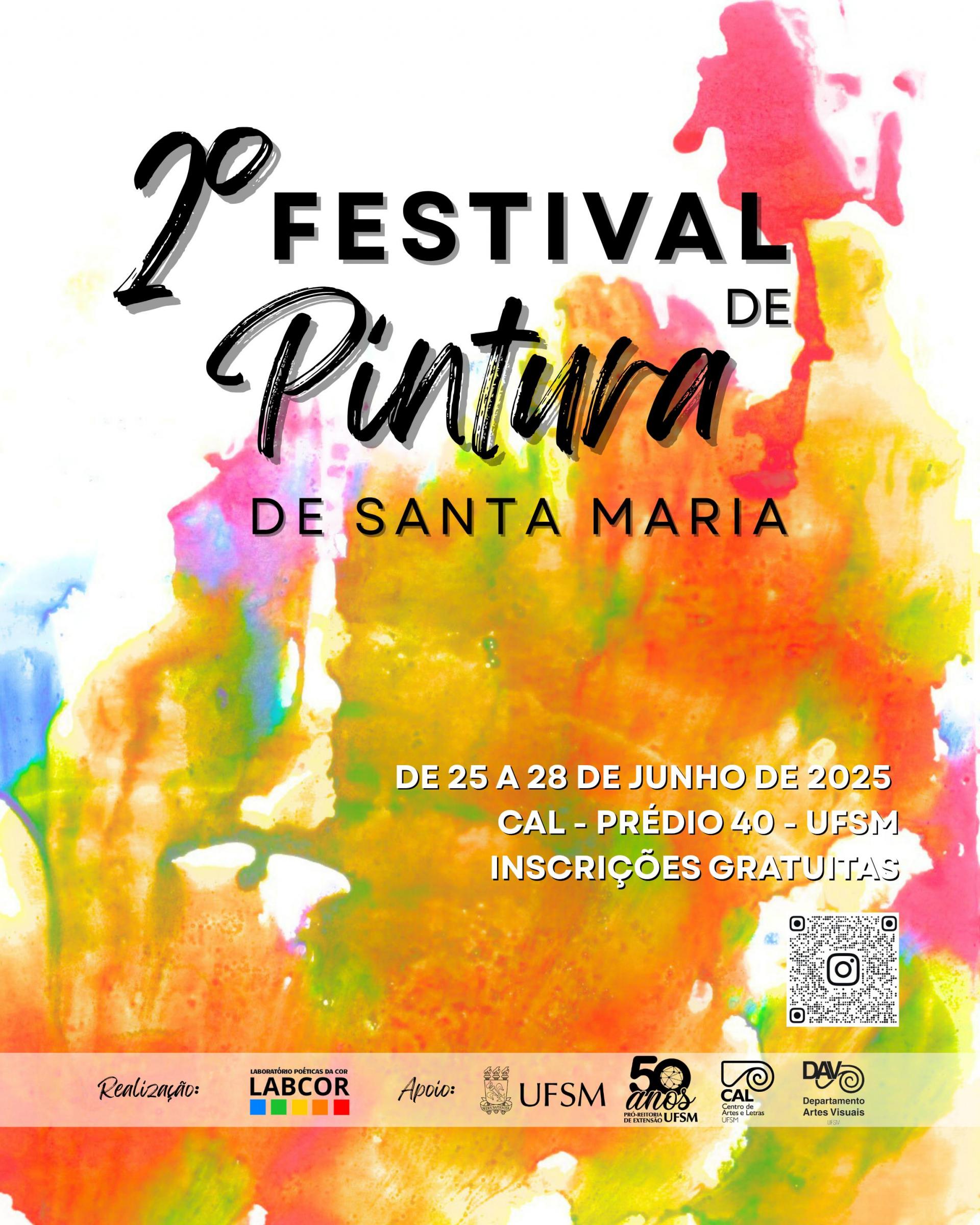Estão abertas as inscrições para o 2º Festival de Pintura de Santa Maria, programa de extensão da UFSM que ocorrerá de 25 a 28 de junho, no prédio 40, do Centro de Artes e Letras (CAL). Serão oferecidas à comunidade 33 oficinas ao longo dos quatro dias de festival.