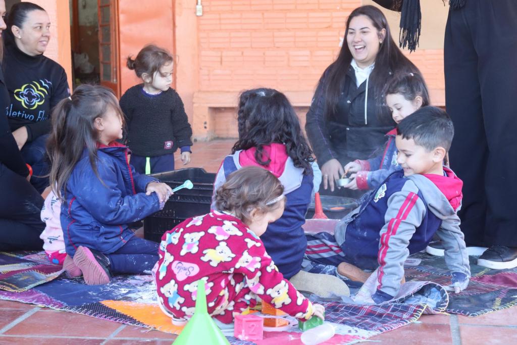 O que surgiu como ação pontual se transformou em demanda, virou projeto e foi contemplado no edital do Proext-PG. O primeiro passo foi a criação de territórios para as crianças: espaços de brincadeiras, de diversão, de convivência uns com os outros. São organizados a partir de objetos diversos, que podem ser tanto brinquedos quanto aquilo que as educadoras chamam de materiais não estruturados: galhos, folhas, caixas de ovo, bacias, caixas de remédio, esmaltes, géis de cabelo, secadores, alimentos coloridos, objetos de cozinha e outros itens que, mesmo não sendo brinquedos, provocam e incentivam o brincar.