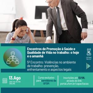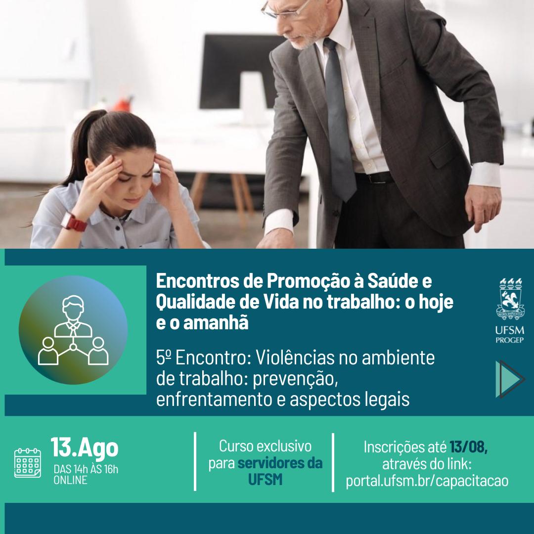 A Pró-Reitoria de Gestão de Pessoas (Progep) informa aos servidores da UFSM que no dia 13 de agosto ocorre a quinta atividade do ciclo Encontros de Promoção à Saúde e Qualidade de Vida no Trabalho: o Hoje e o Amanhã. Com início às 14h, no formato on-line, o encontro terá como tema “Violências no ambiente de trabalho: prevenção, enfrentamento e aspectos legais”. O assunto será abordado pela psicóloga Mayra Osório, da Universidade Federal do Pampa (Unipampa), e pelo advogado Heverton Monteiro.