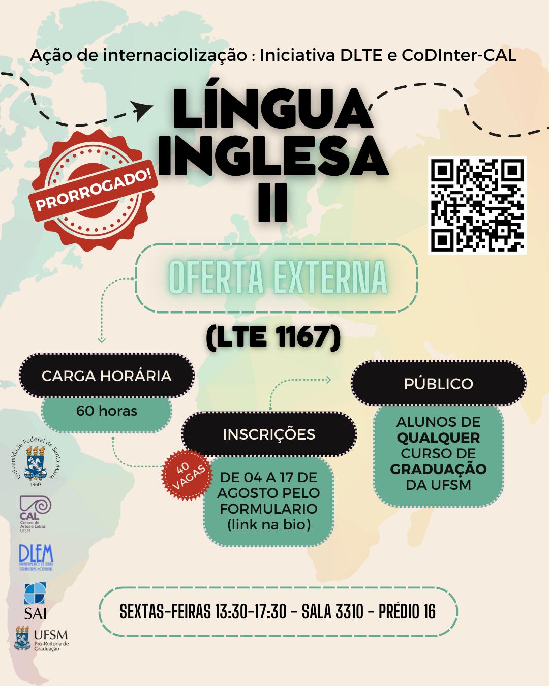 O Departamento de Letras Estrangeiras Modernas (DLTE) da UFSM informa que estão abertas até o próximo domingo (17) as inscrições na disciplina eletiva Língua Inglesa II (LTE 1167). A disciplina conta com 40 vagas, não tem pré-requisito e é voltada para alunos de qualquer curso de graduação da UFSM. Portanto, pode se inscrever mesmo quem não fez a disciplina Língua Inglesa I (LTE 1166), desde que tenha conhecimento básico de inglês. Com início no dia 22 de agosto, as aulas serão nas sextas-feiras, das 13h30min às 17h30min, na sala 3310 do Centro de Educação – prédio 16 do campus sede.