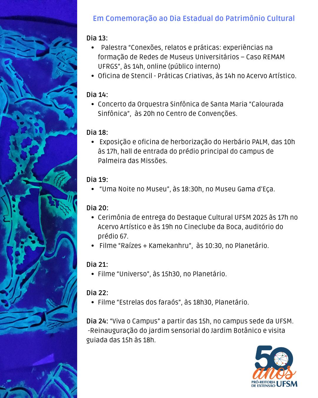 Na UFSM, a programação alusiva à data – disponível na íntegra na imagem ao lado – inicia-se nesta quarta-feira (13), com uma palestra sobre a Rede de Museus Universitários e uma oficina de stencil. Outro destaque da programação ocorre nesta quinta-feira (14): o concerto Calourada Sinfônica, que a Orquestra Sinfônica de Santa Maria apresenta às 20h no Centro de Convenções (cujos ingressos, entretanto, estão esgotados).
