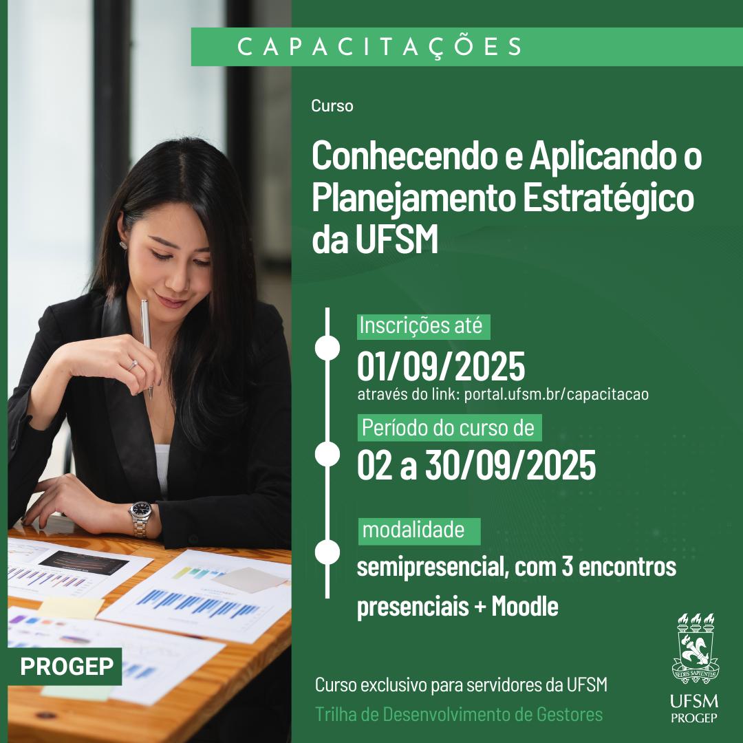 A Pró-Reitoria de Gestão de Pessoas (Progep) da UFSM informa que estão abertas as inscrições para o curso “Conhecendo e aplicando o planejamento estratégico da UFSM”, promovido em parceria com a Pró-Reitoria de Planejamento (Proplan) e destinado a servidores ocupantes de cargos de chefia.