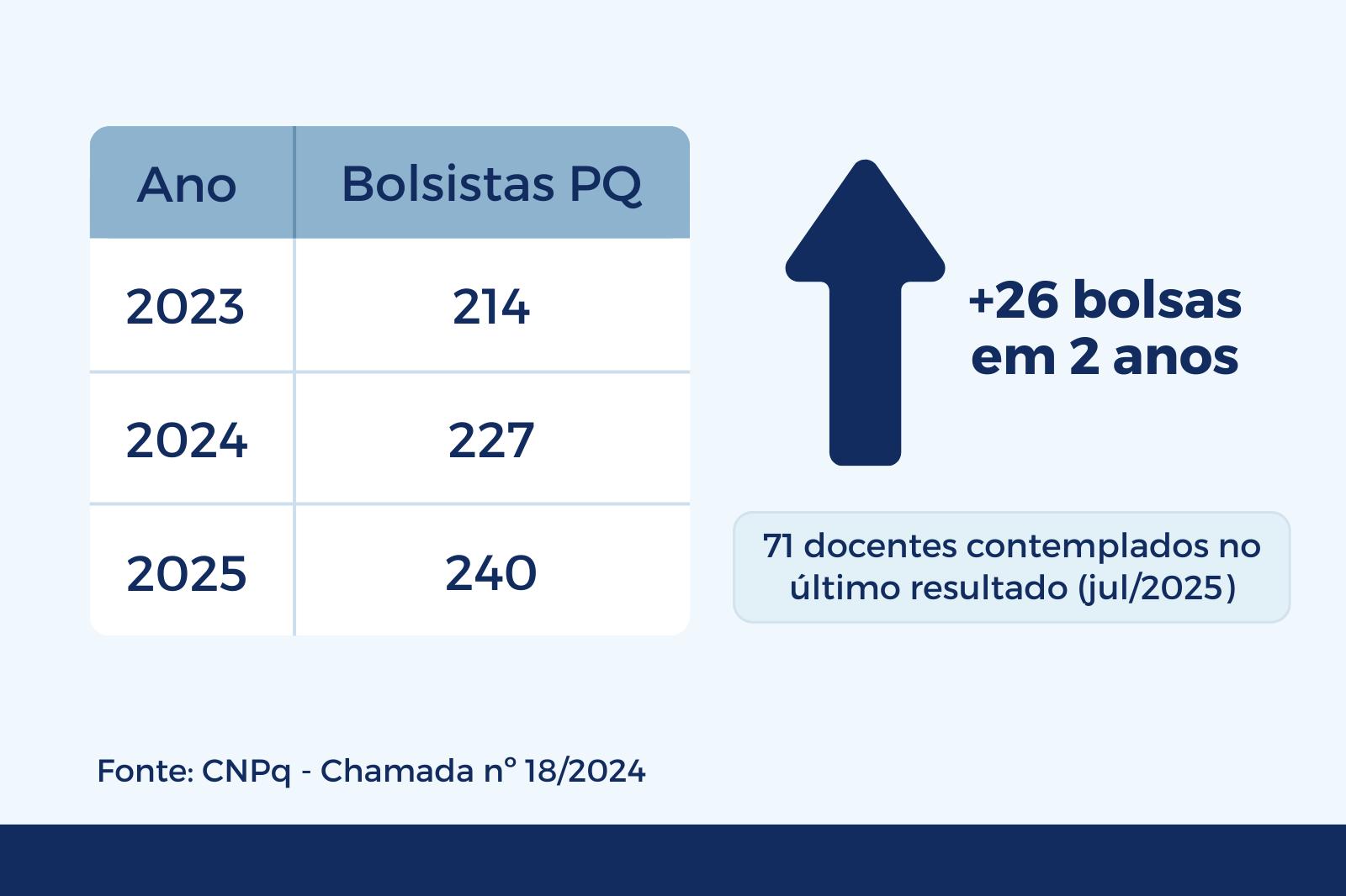 Nos últimos três anos, a UFSM obteve um aumento no número de bolsas de produtividade em pesquisa (PQ) concedidas pelo Conselho Nacional de Desenvolvimento Científico e Tecnológico (CNPq). Em 2023, eram 214 bolsistas PQ. Em 2024, o número passou para 227. Neste ano, já são 240 bolsistas PQ. No mais recente resultado, no final de julho, a Chamada CNPq nº 18/2024 – Bolsas de Produtividade contemplou 71 docentes da Instituição.