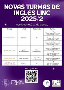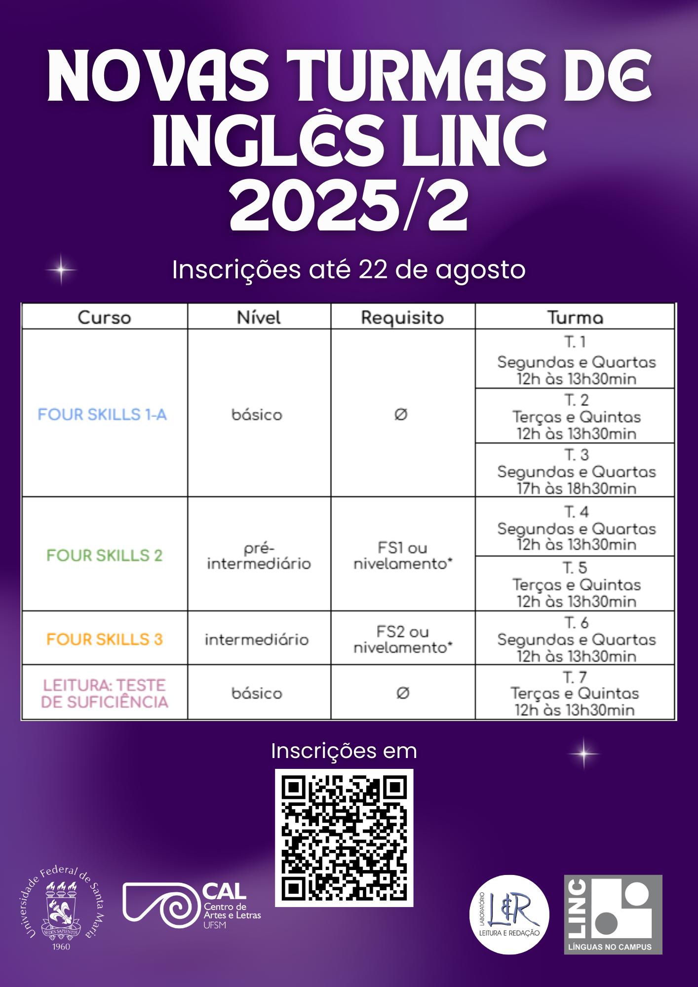 O programa Línguas no Campus (Linc) da UFSM prorrogou até esta sexta-feira (22) as inscrições para ingresso nos seus cursos de inglês. Os cursos oferecidos são divididos em duas modalidades: habilidades integradas – ler, ouvir, falar e escrever (Four Skills) – e leitura de textos acadêmicos em inglês (preparatório para o Teste de Suficiência).